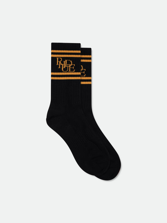 Signature cotton-poly sport sock with Rhude scramble logo placed in-between stripes. Designed for athletics and...