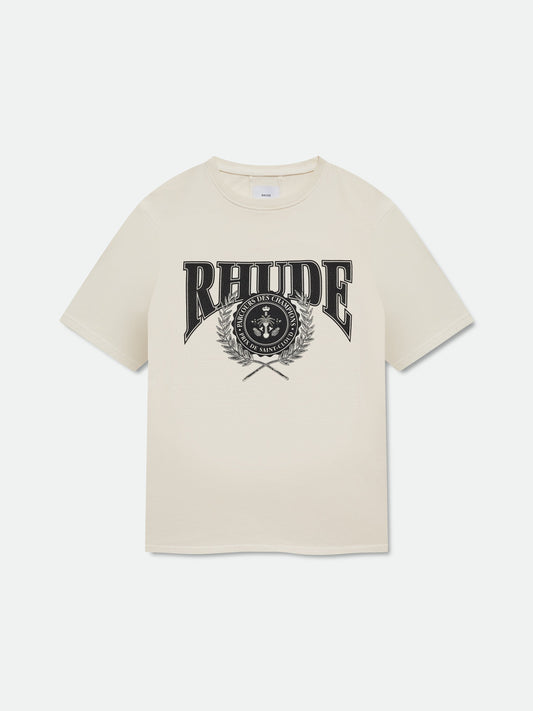 Custom-vintage fit cotton tee shirt with a ribbed neckline and short sleeves. Features RHUDE Collegiate...