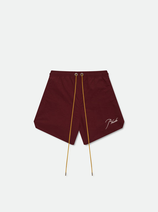 Premium washed nylon short with white logo print across front legs, and co-branded Rhude x...