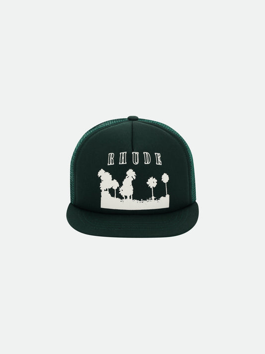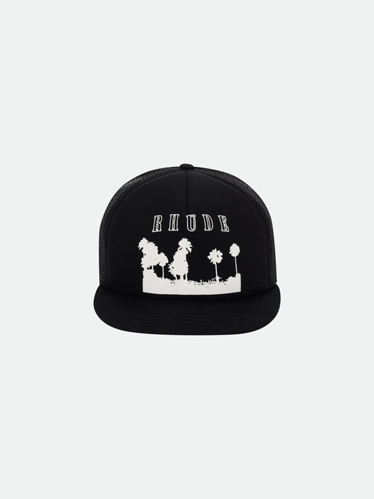Heavyweight vintage trucker cap with Rhude "Thousand Palms" printed design on the front. Back panel...