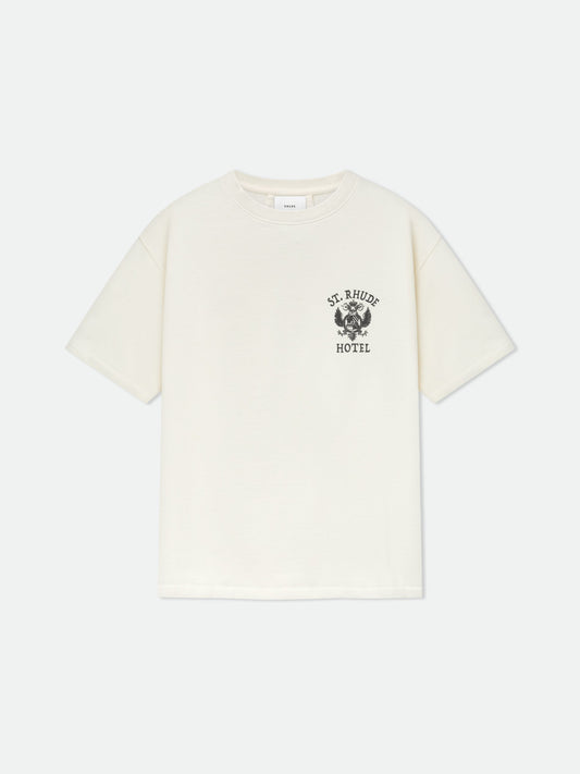 Custom-fit vintage wash cotton short sleeve tee-shirt with Rhude "Notting Hill Eagle" inspired designs printed...