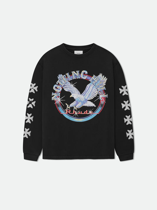 Custom-fit vintage wash cotton long sleeve tee-shirt with Rhude "Notting Hill Eagle" inspired designs printed...