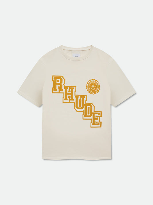 Custom-vintage fit cotton tee shirt with a ribbed neckline and short sleeves. Features RHUDE Collegiate...