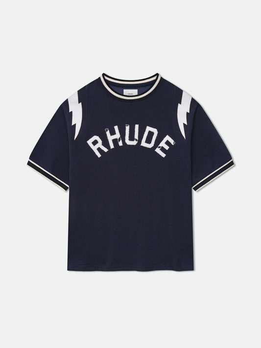 Premium tee crafted from soft, lightweight fabric. Rhude Lightning Ringer jersey graphic showcased on the...