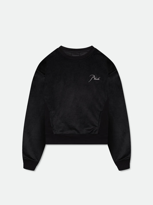 Long sleeve velour crewneck with Rhude classique script logo embroidered on the front, with a...