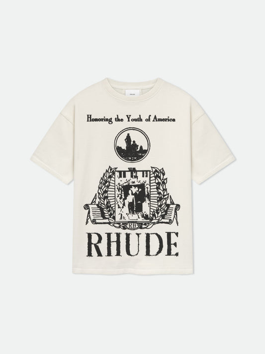 Custom-fit vintage wash cotton short sleeve tee-shirt with Rhude "Youth of America" graphics printed at front,...