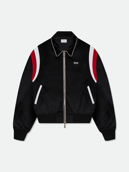 Velour track varsity jacket with Rhude logo on front, and appliques at each shoulder. Finished...