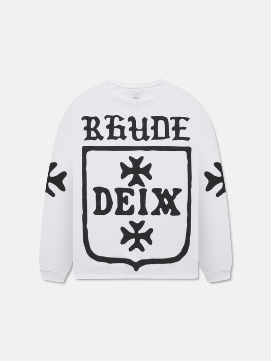 Custom-fit vintage wash oversized cotton long sleeve tee-shirt with Rhude Deix Shield graphics puff printed...