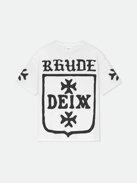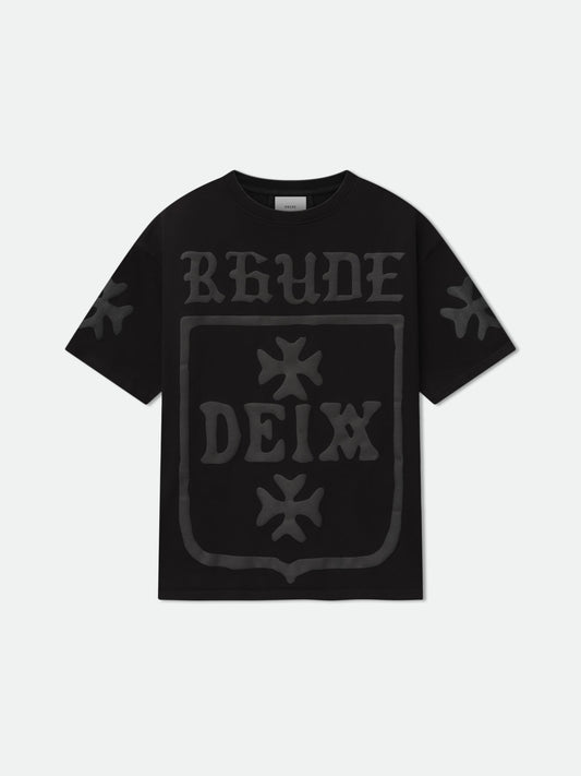 Custom-fit vintage oversized wash cotton short sleeve tee-shirt with Rhude Deix Shield graphics puff printed...