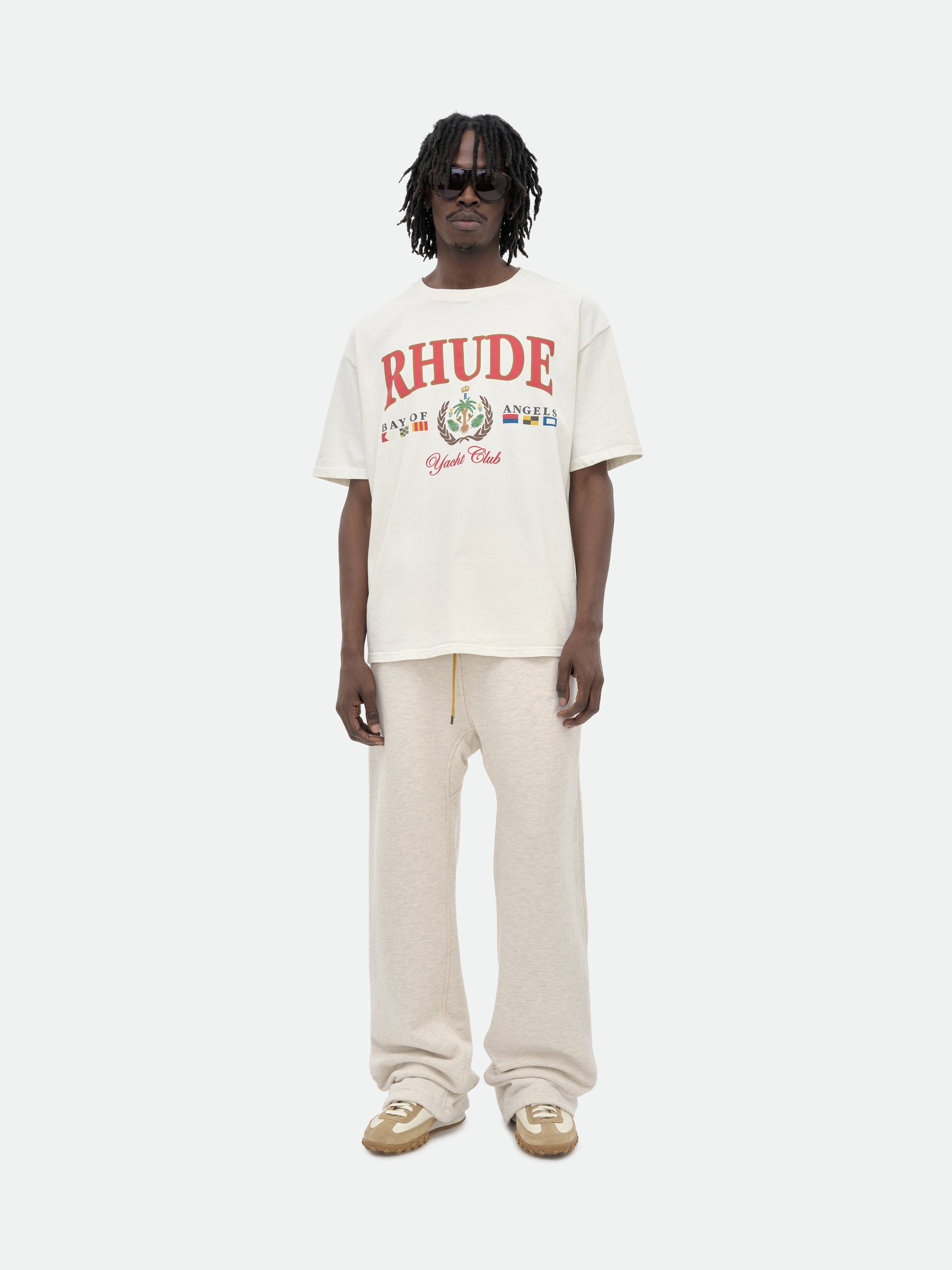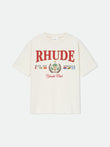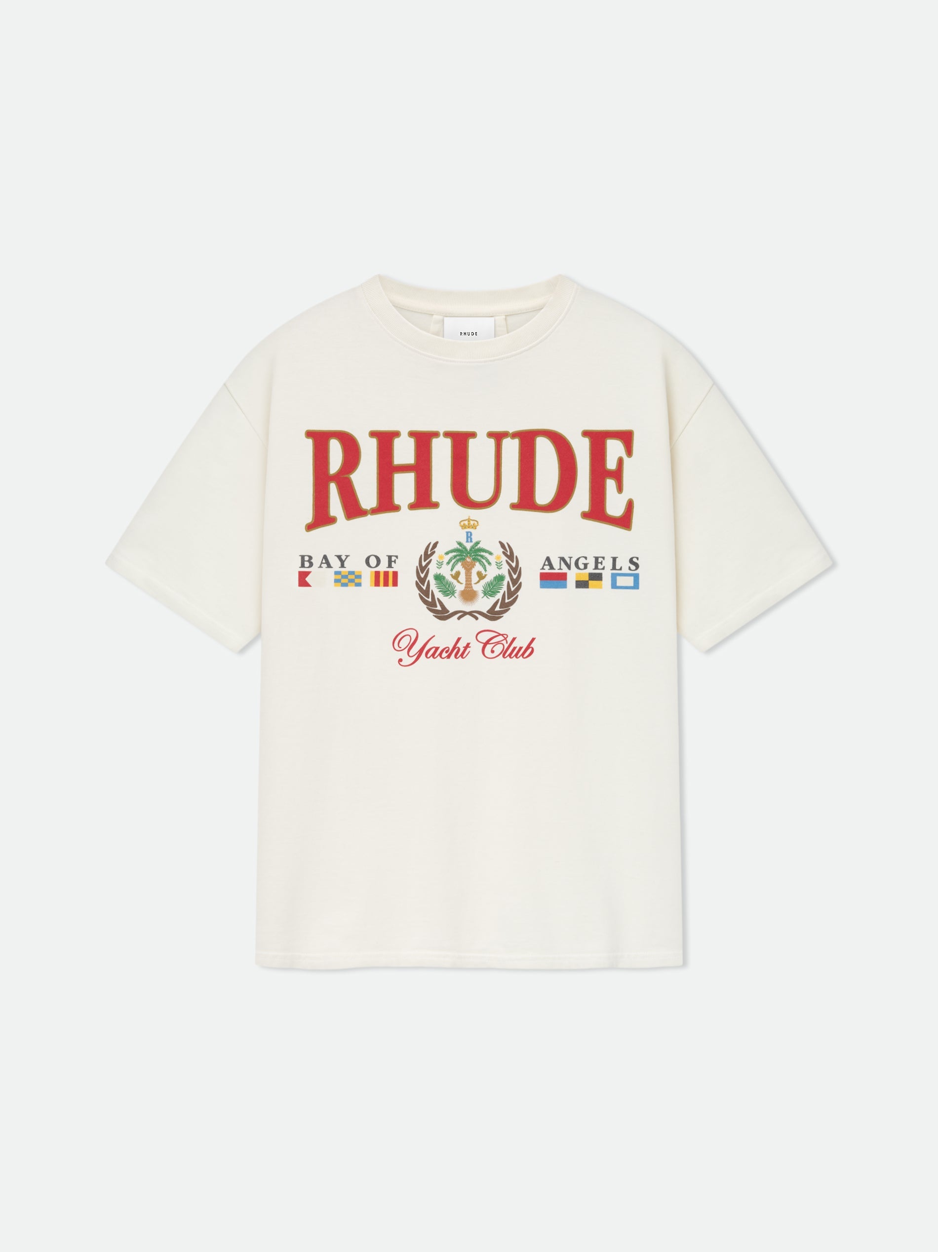 Custom-fit vintage wash cotton short sleeve tee-shirt with Rhude "Bay of Angels" Yacht Club graphics printed at front, with a clean back.