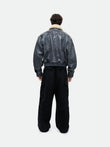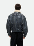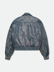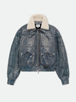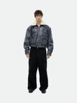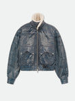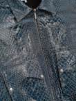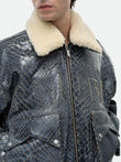 Blue Croc Embossed Leather Jacket with a detachable Sherpa collar featuring "RHUDE" Cutout Lettering on the front. The jacket is equipped with a two-way zipper closure adorned with distinctive Rhude Pill hardware and customized Rhude pill snap closures on pockets and sleeves.