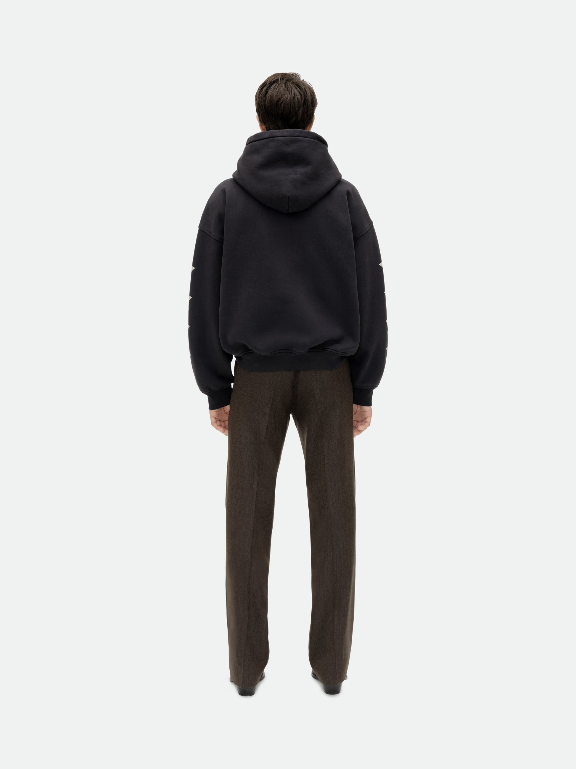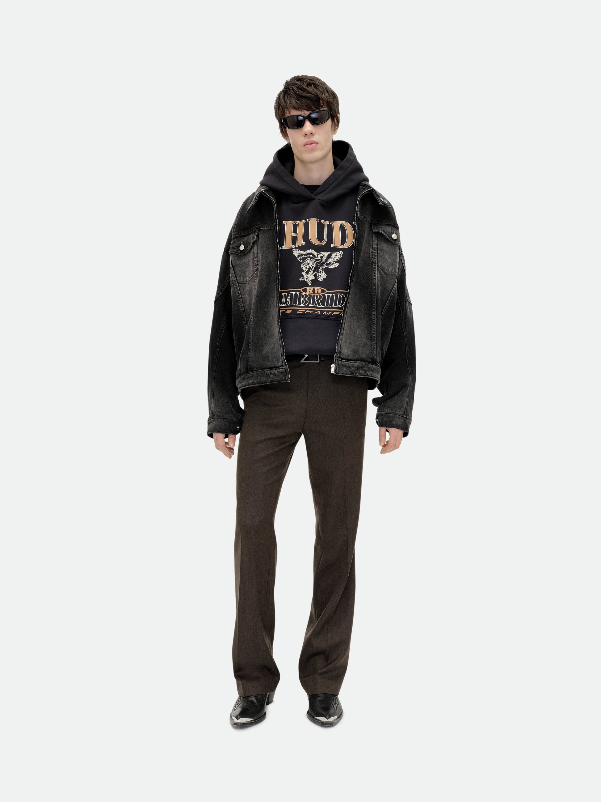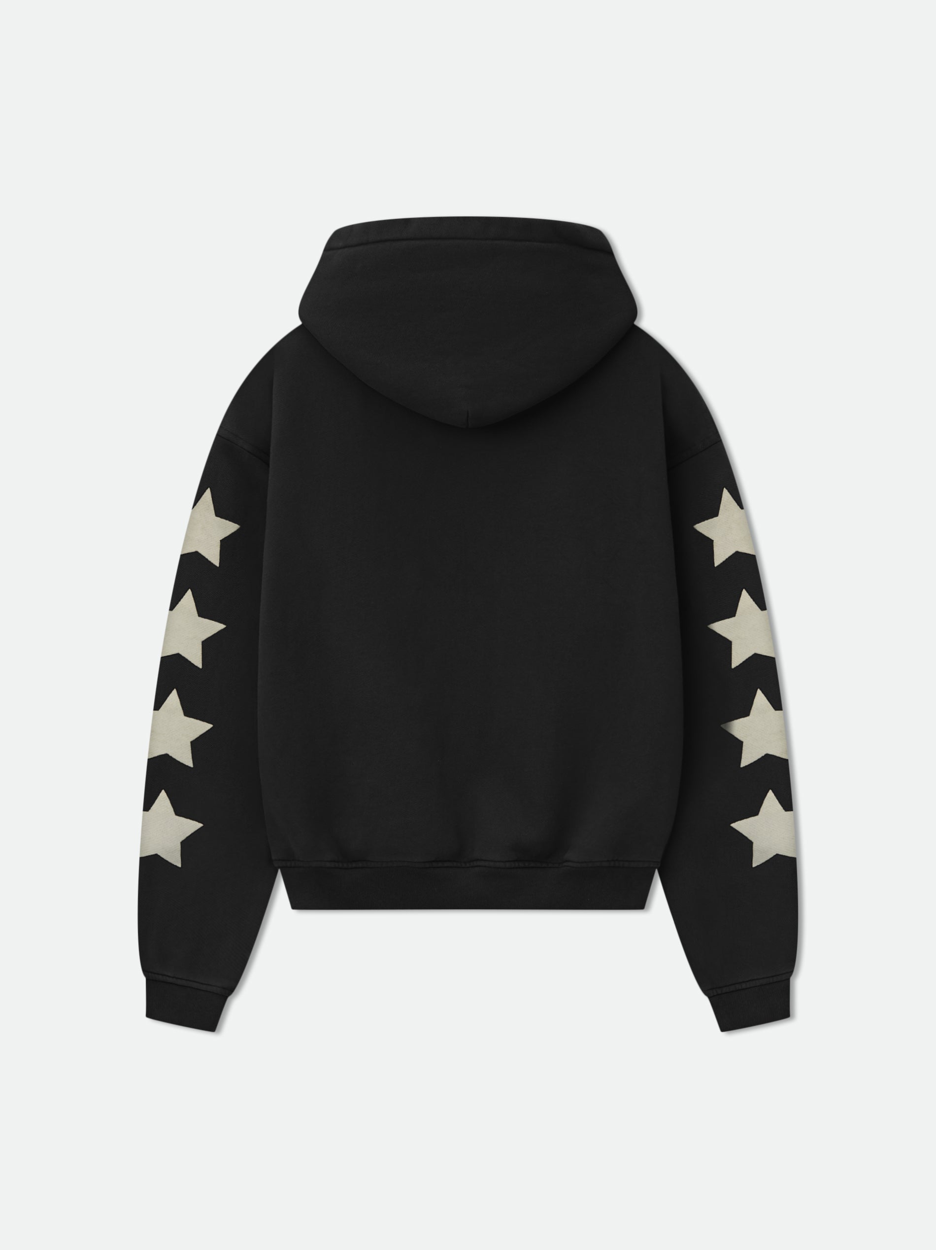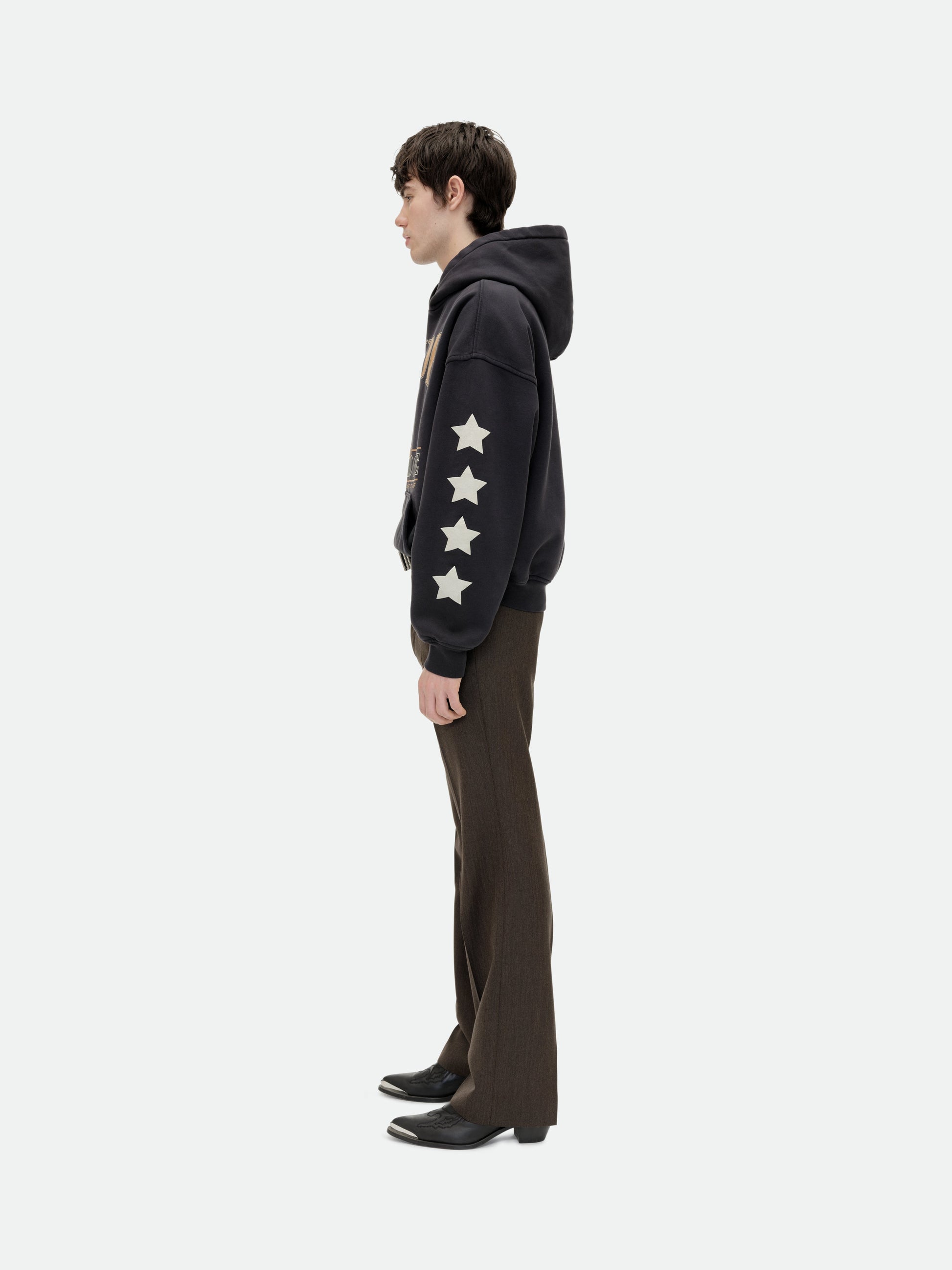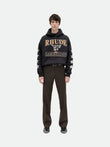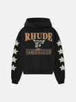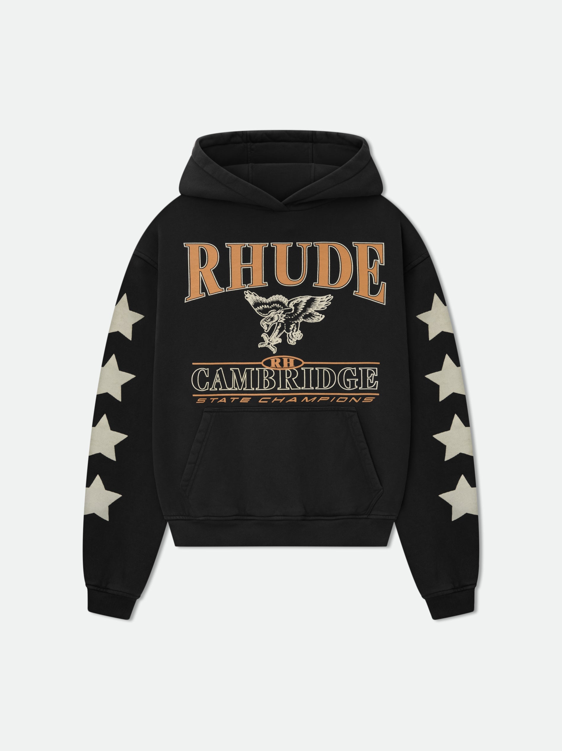 Long sleeve french terry hoodie with Rhude Cambridge graphic designs printed on the front and sleeves, with a clean back. Featuring a kangaroo front pocket and dropped shoulders. Each piece is unique and print distressing my vary per style.