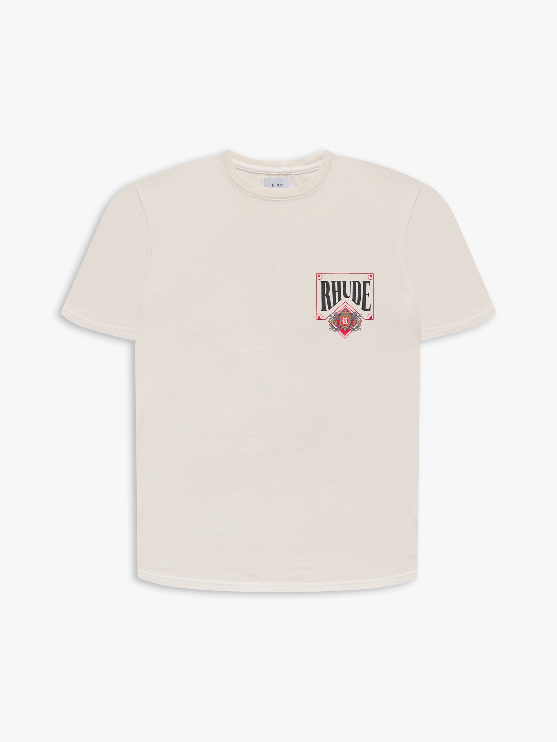 Custom-fit vintage wash cotton short sleeve tee-shirt with Rhude "CARD" graphics printed at front chest and back.