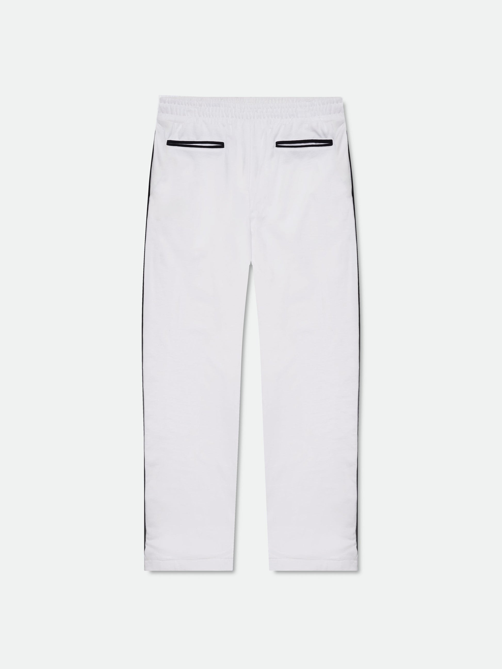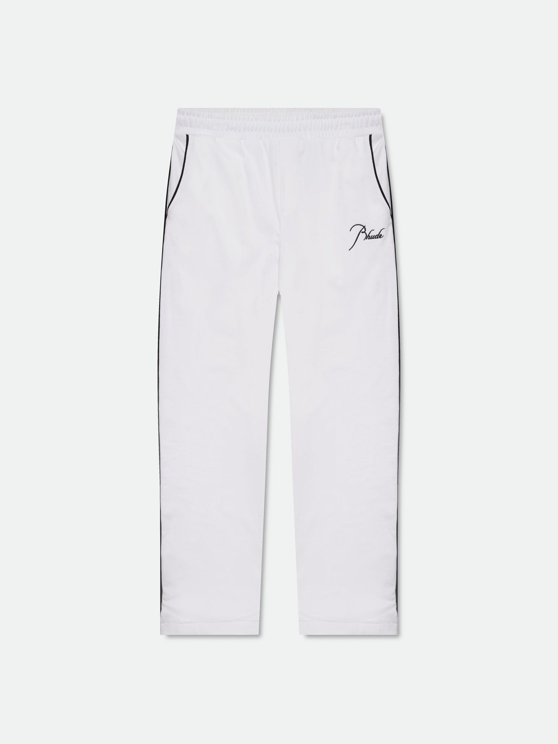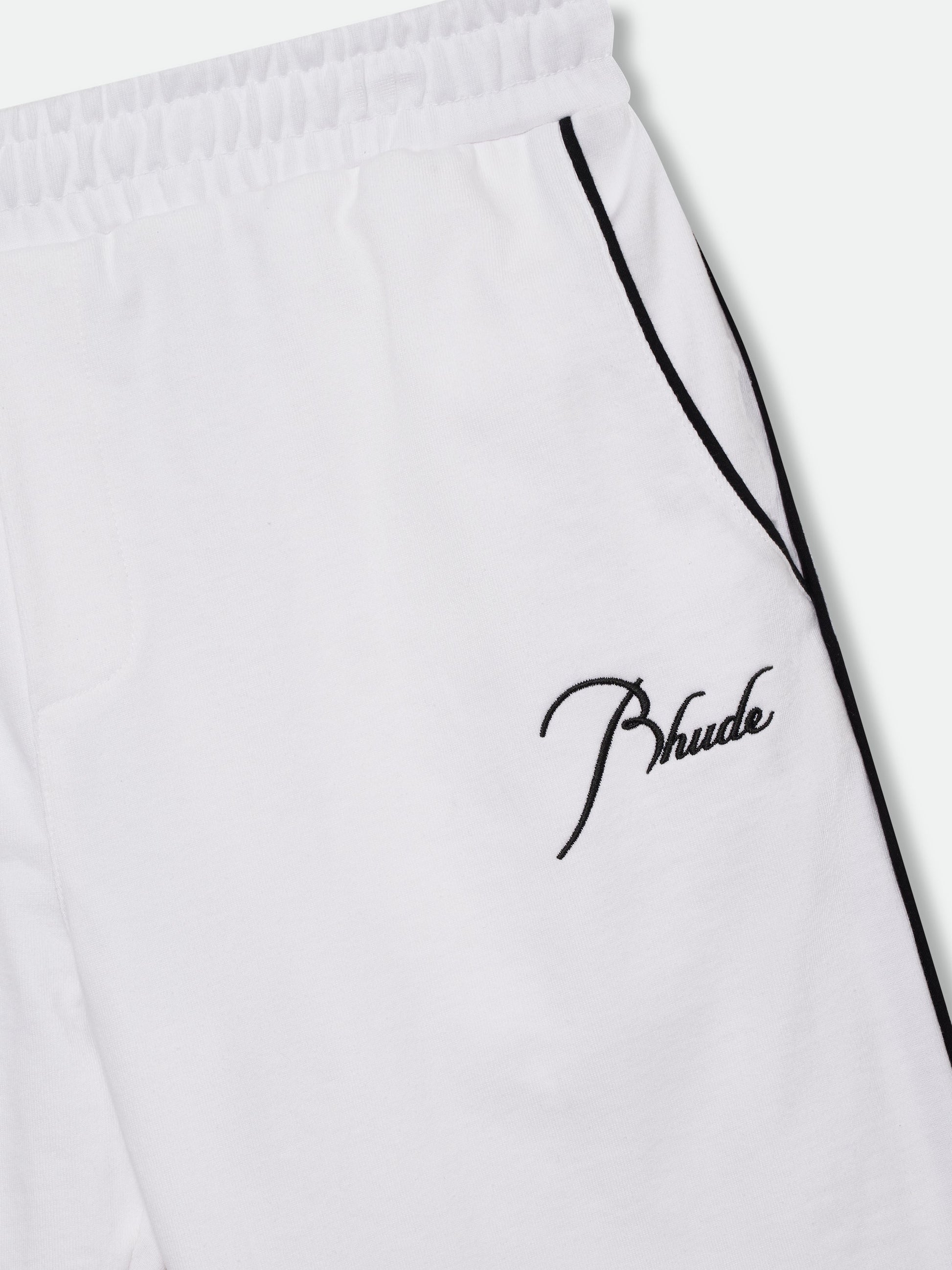 Heavyweight PJ pant with signature Rhude script logo embroidered on the front featuring piping details including on welt pockets on the side and back.