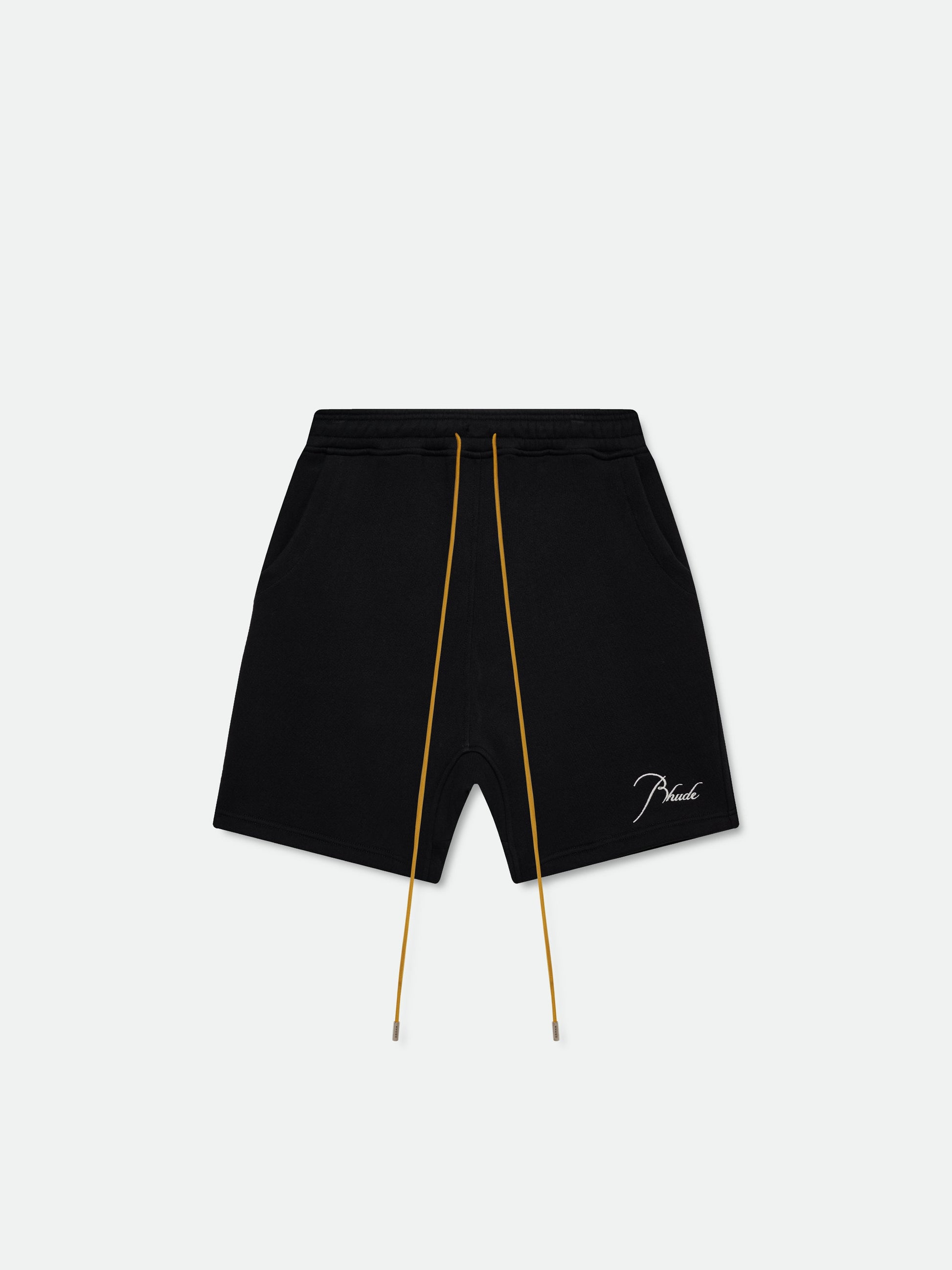 Heavyweight sweat short with signature Rhude logo embroidered on the front, featuring exaggerated drawstrings in our signature Mustard tone.