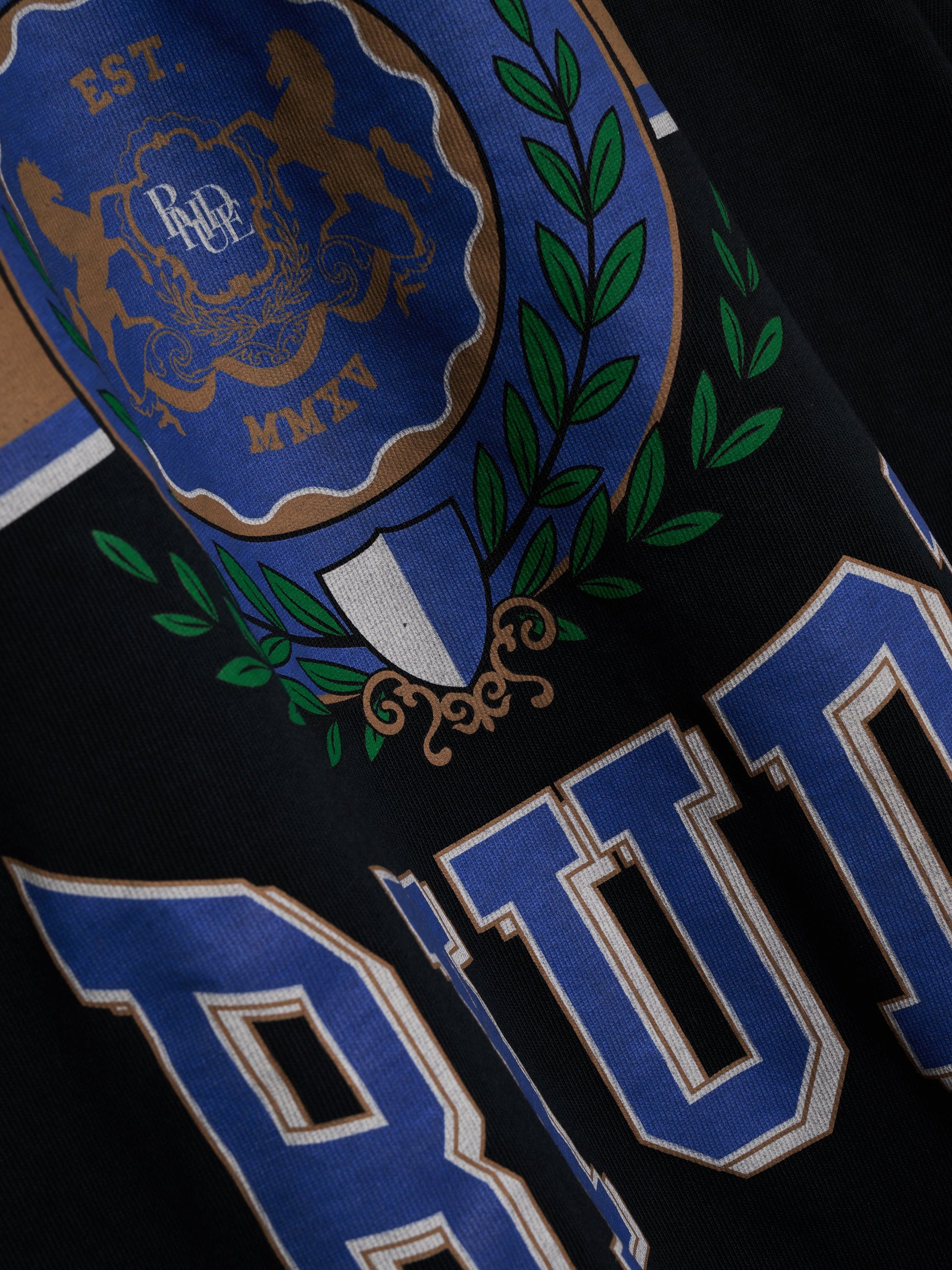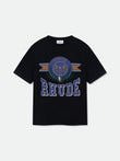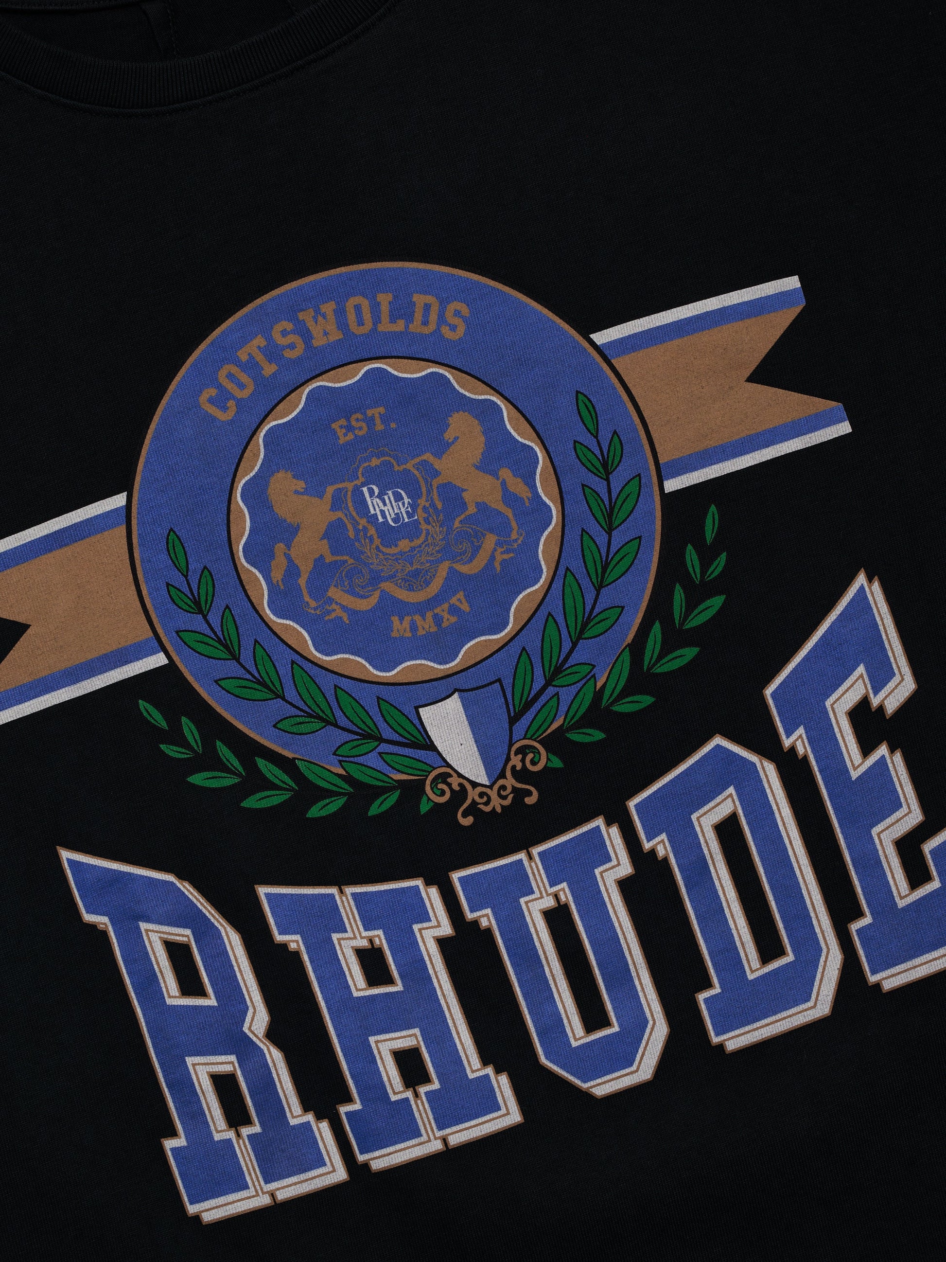 Custom-fit vintage wash cotton short sleeve tee-shirt with Rhude "Cotswold" university inspired graphics printed at front, with a clean back.