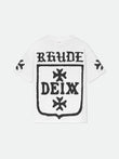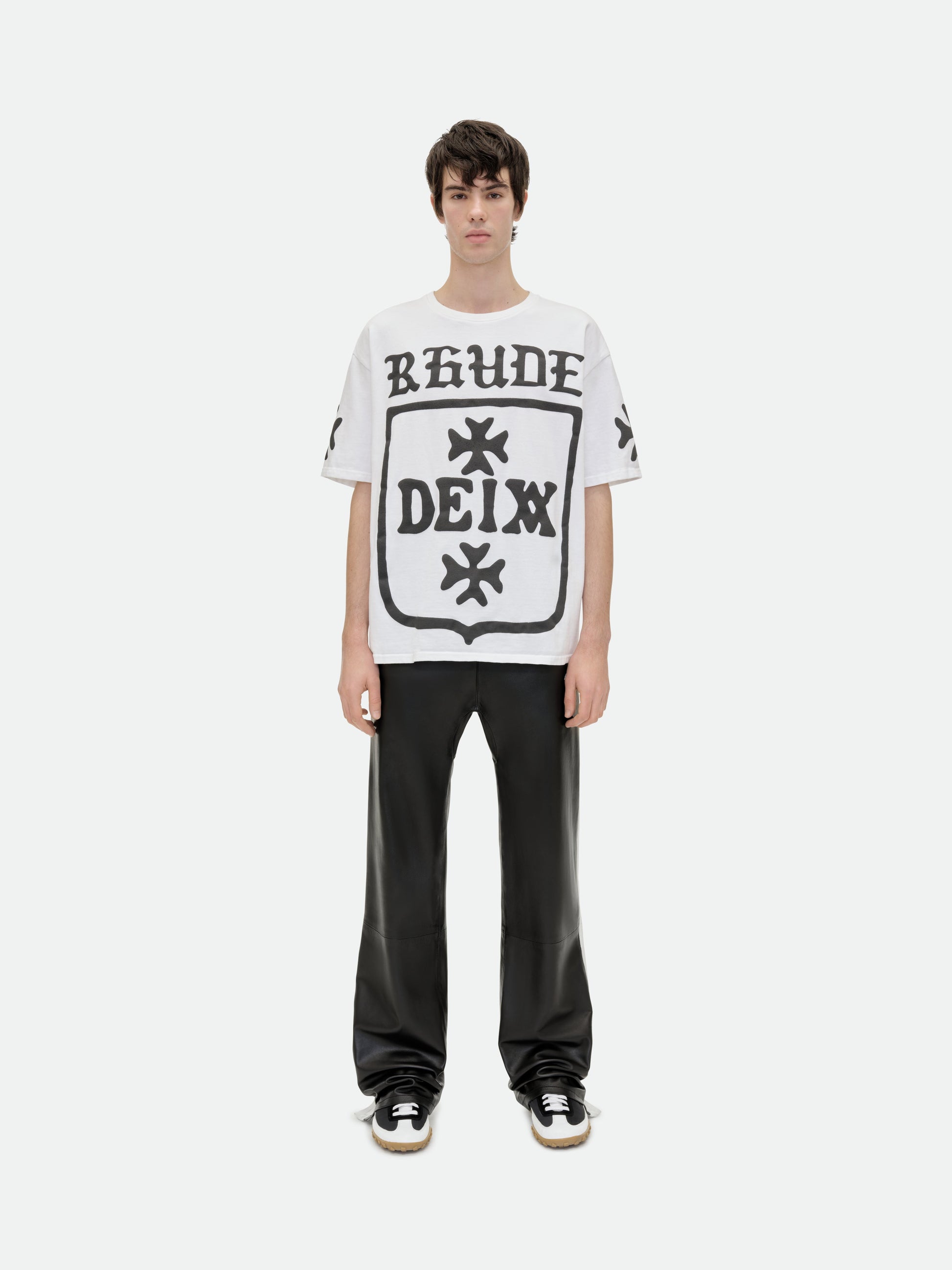 Custom-fit vintage wash oversized cotton short sleeve tee-shirt with Rhude Diex Shield graphics puff printed at front, with a clean back.