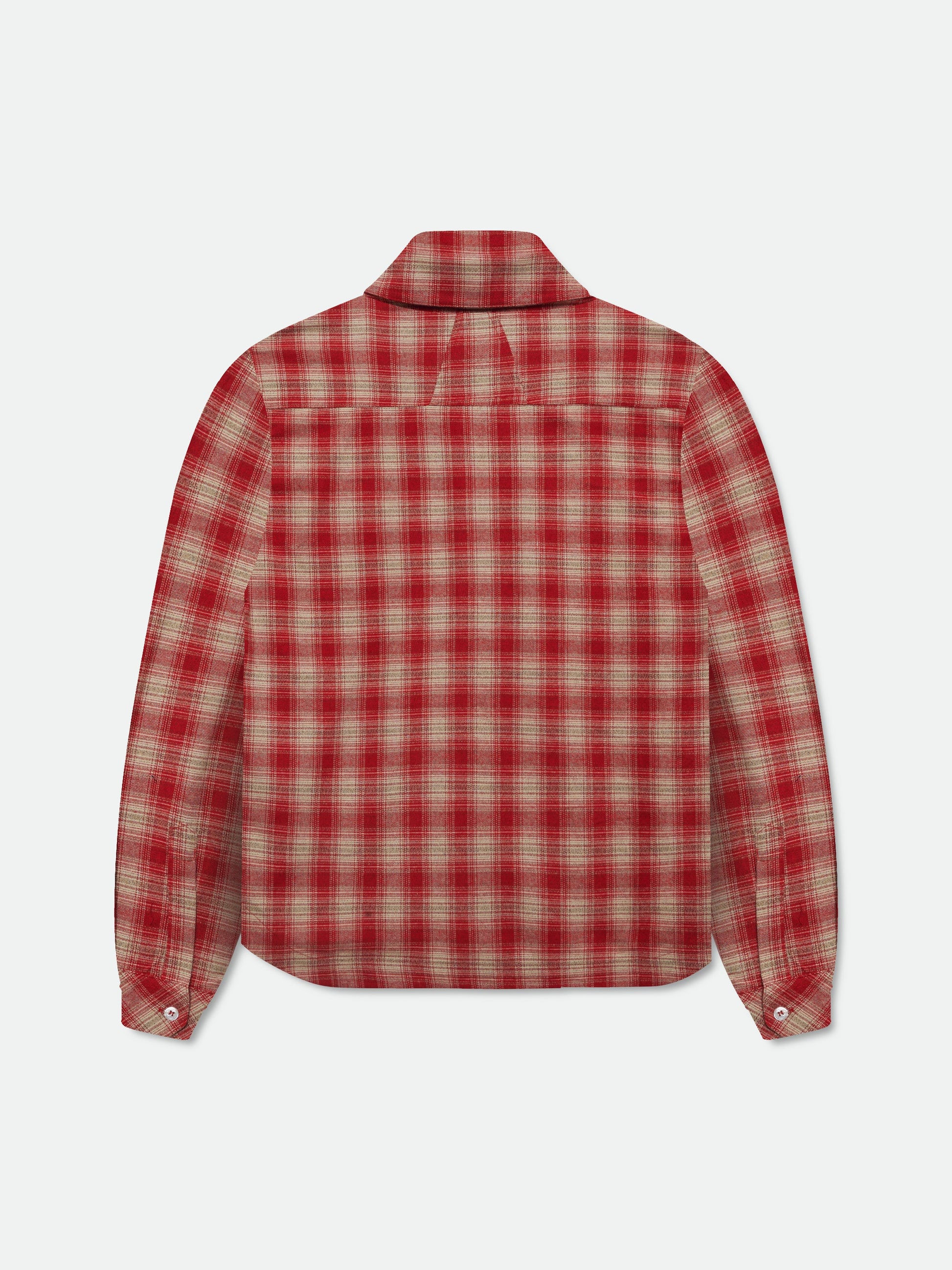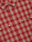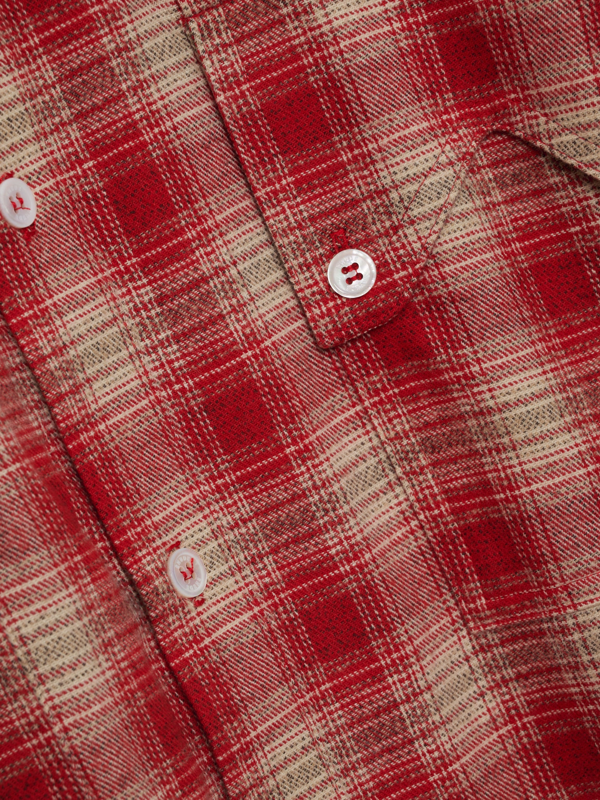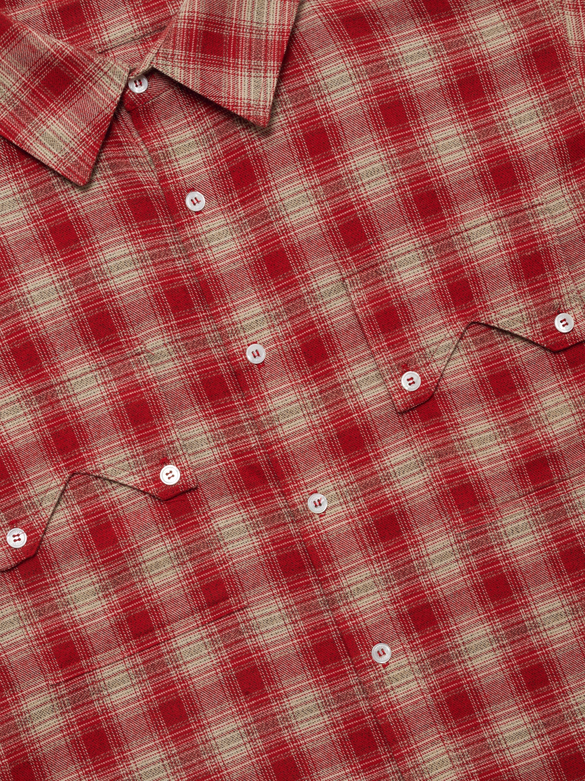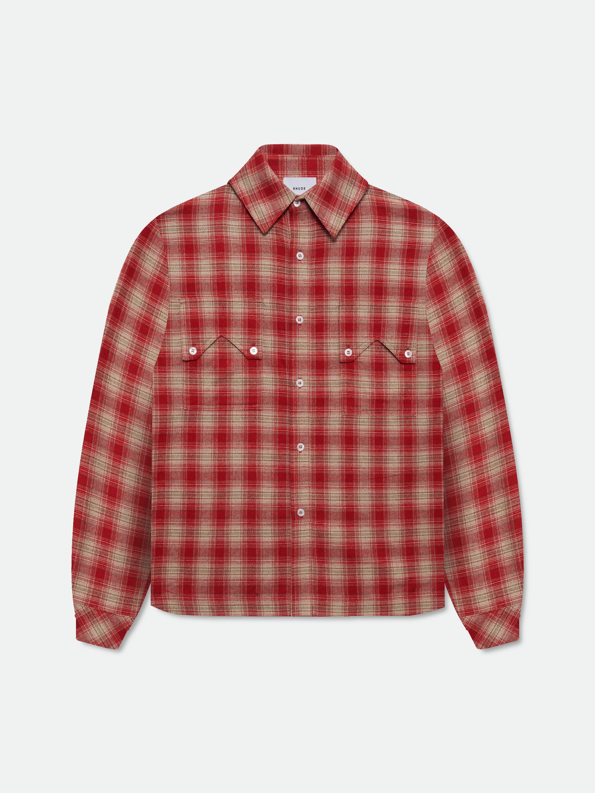 Premium long sleeve shirt crafted from high-quality, mid-weight flannel material. Features a camp collar, dual front chest pockets, custom rhude hardware snap styling, and flat hem.