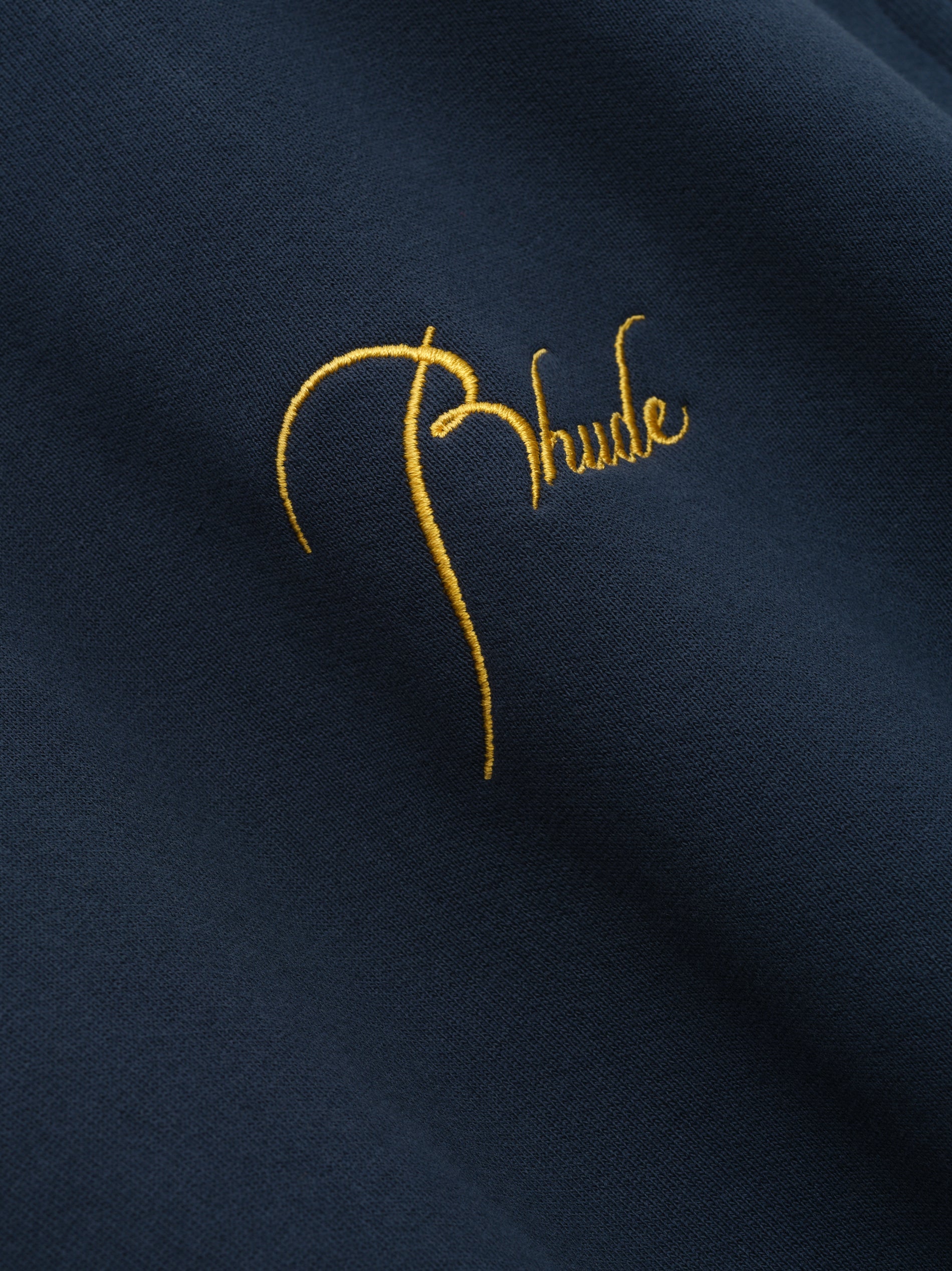 Heavyweight full-zip hoodie with signature Rhude signature script embroidered on the front and back. Two-way zipper closure with custom Rhude Pill Hardware. Each garment is finished with our signature sundry process.
