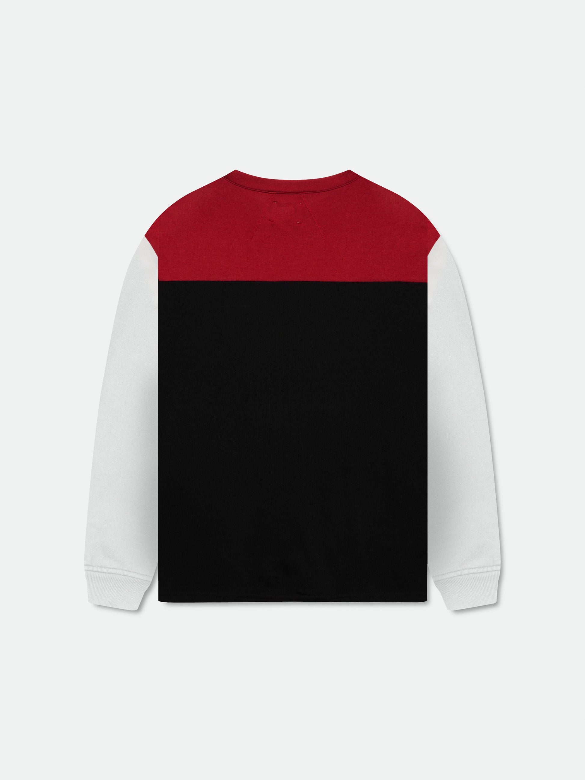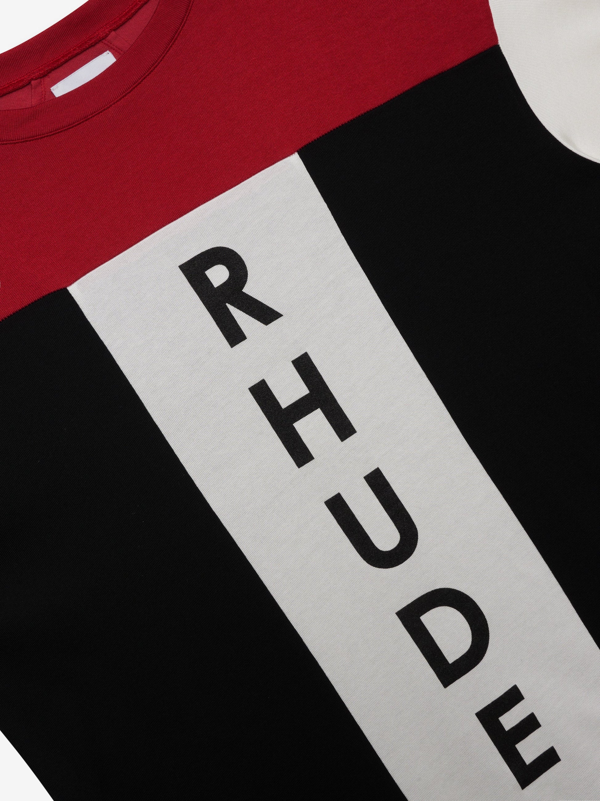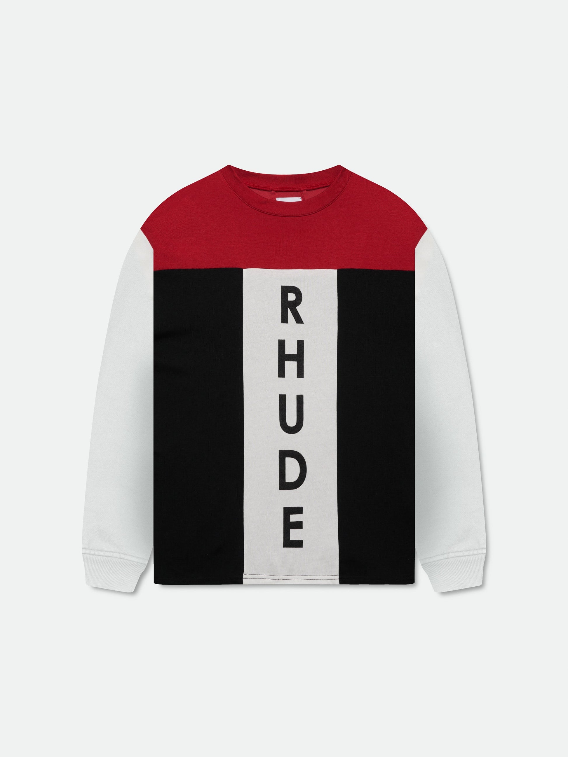 Custom-fit vintage wash cotton long sleeve tee-shirt with Rhude vertical logo design printed on the front, and ribbed sleeves.