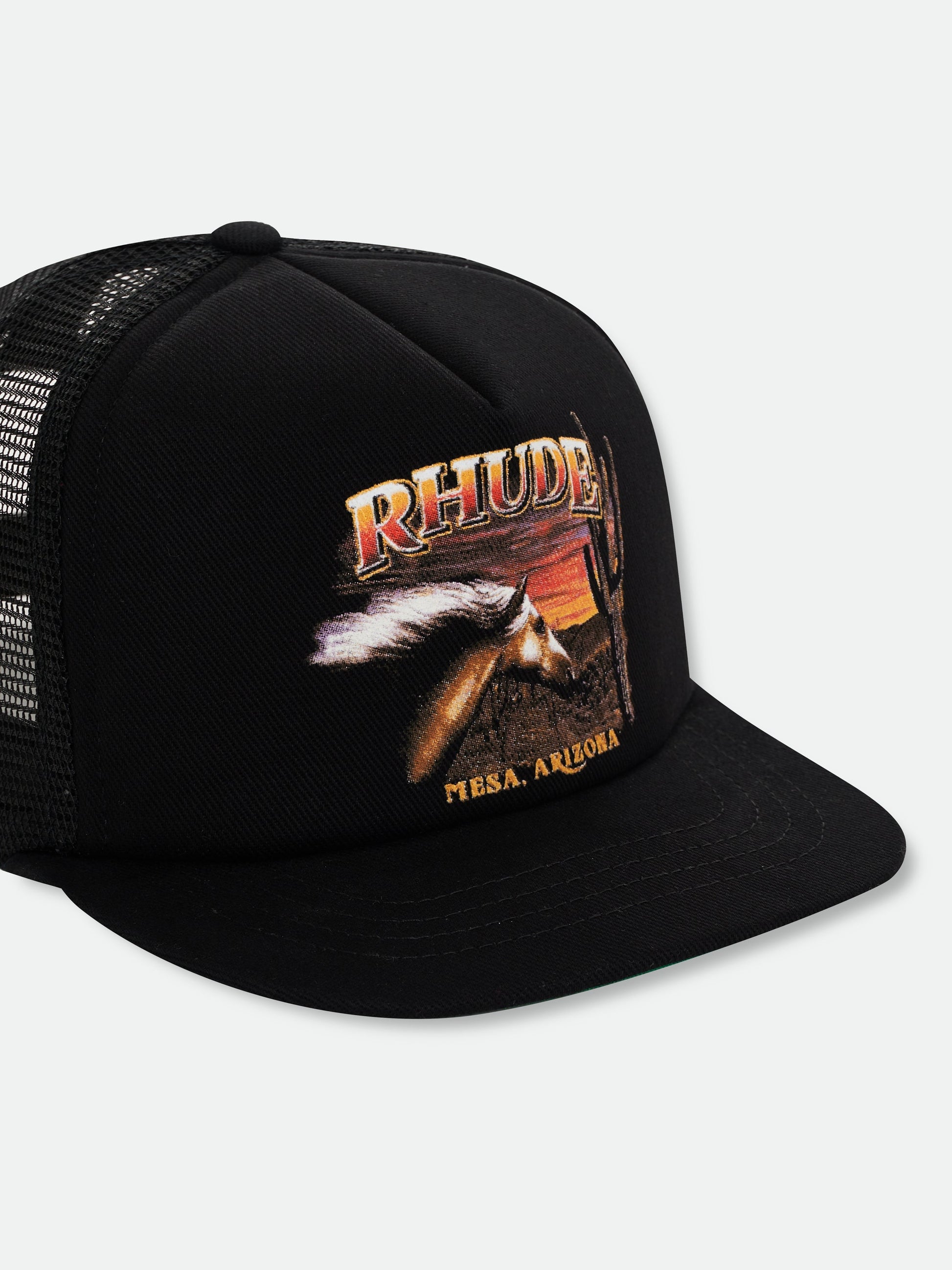 Heavyweight vintage trucker cap with Rhude "Mesa Stallion" printed design on the front. Back panel is constructed with a breathable mesh material. Features an adjustable strap at the back, so you can adjust the fit to your preference, and green under brim.