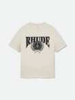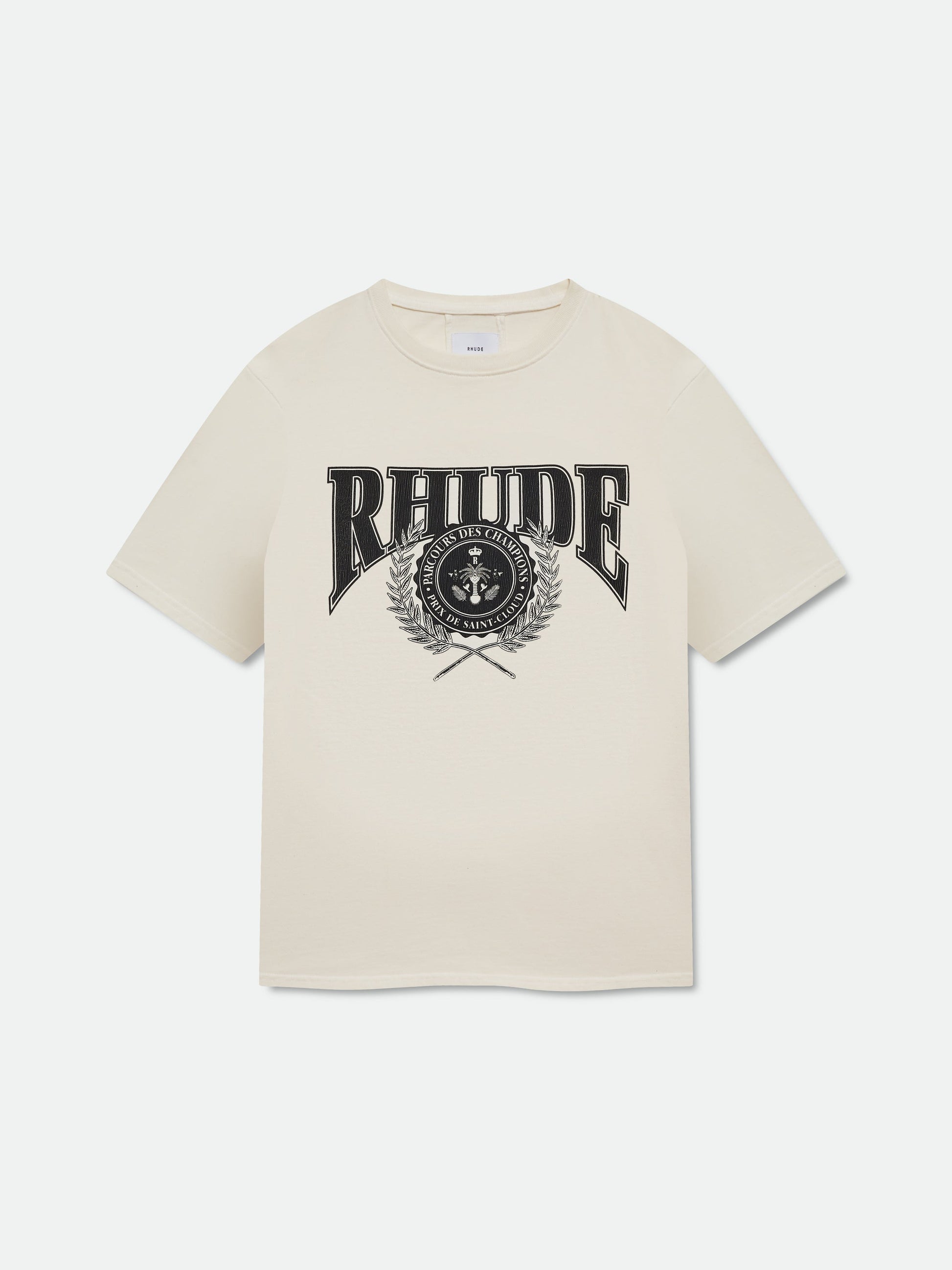 Custom-fit vintage wash cotton short sleeve tee-shirt with Rhude "Parcours Des Champions " graphics printed at front, with a clean back.