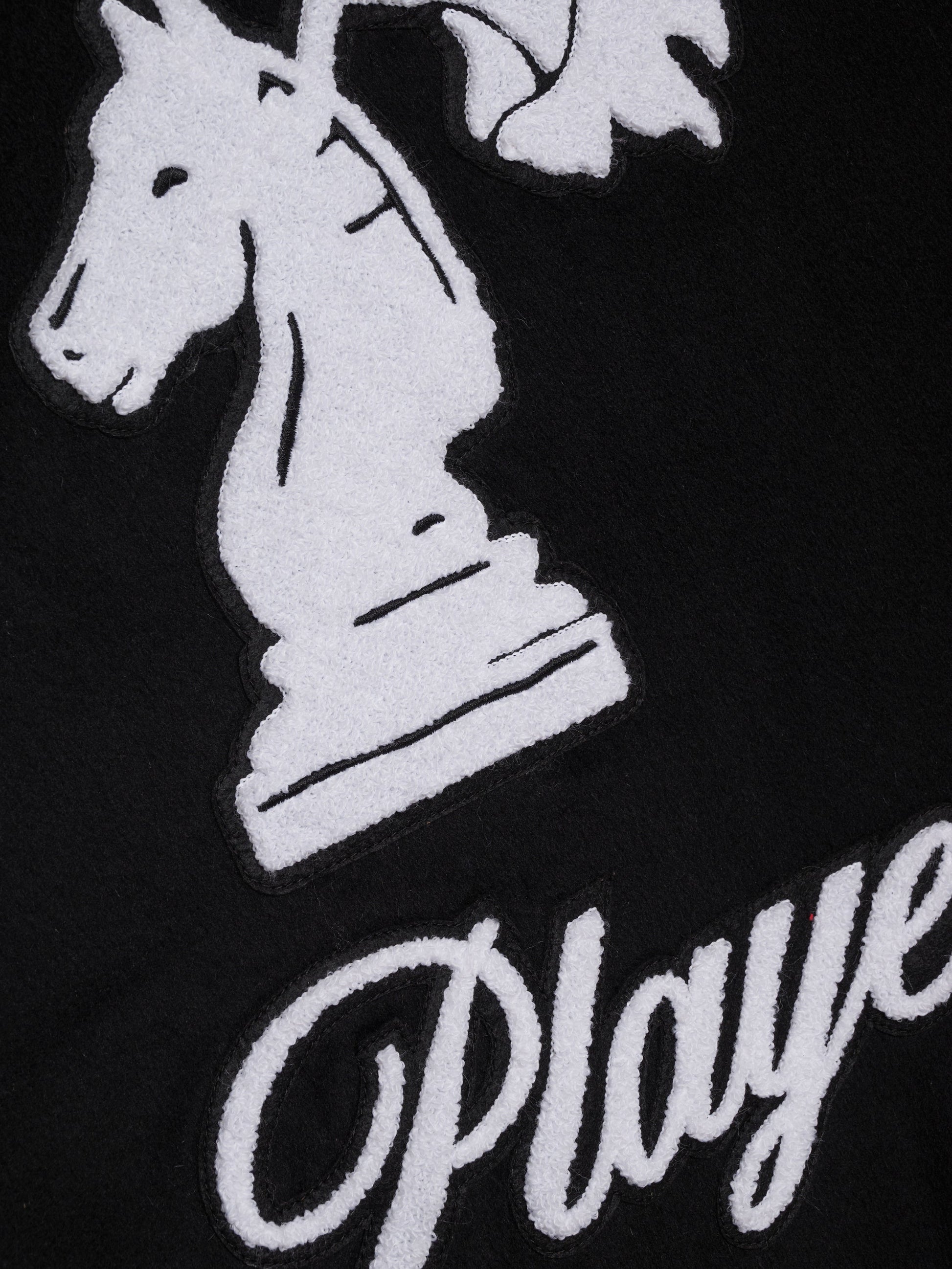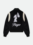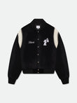 Premium Jacket features embroidered "RHUDE" logo on the front and back, applique placed on shoulders, custom Rhude pill hardware for closure. Twin pockets at front. Features a ribbed waist, and cuffs.