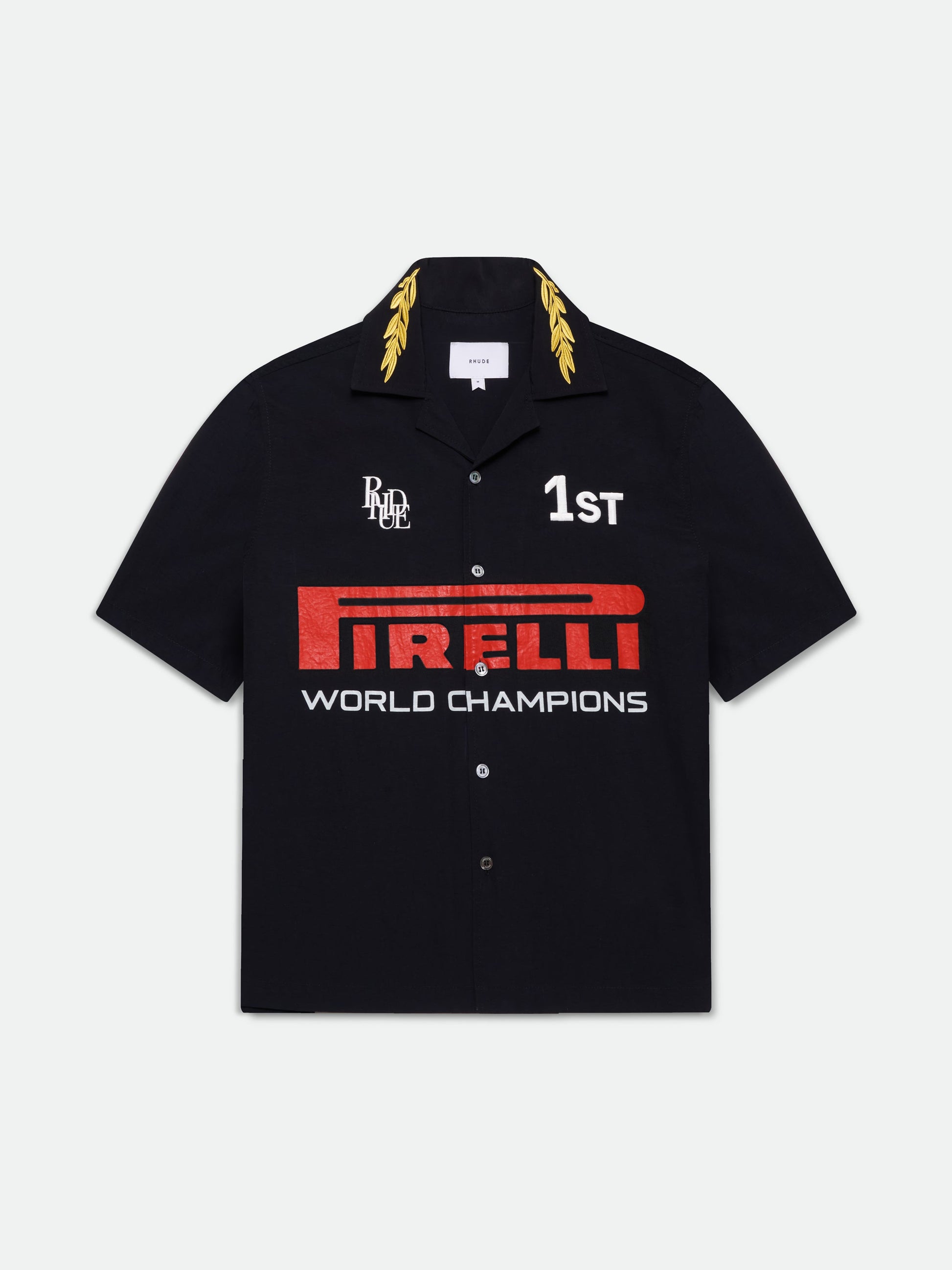 Premium short sleeve shirt crafted from high-quality, mid-weight nylon material. Features a camp collar, singular front chest pocket, button down styling, and flat hem. Co-branded Rhude x Pirelli designs throughout front, with a clean back.