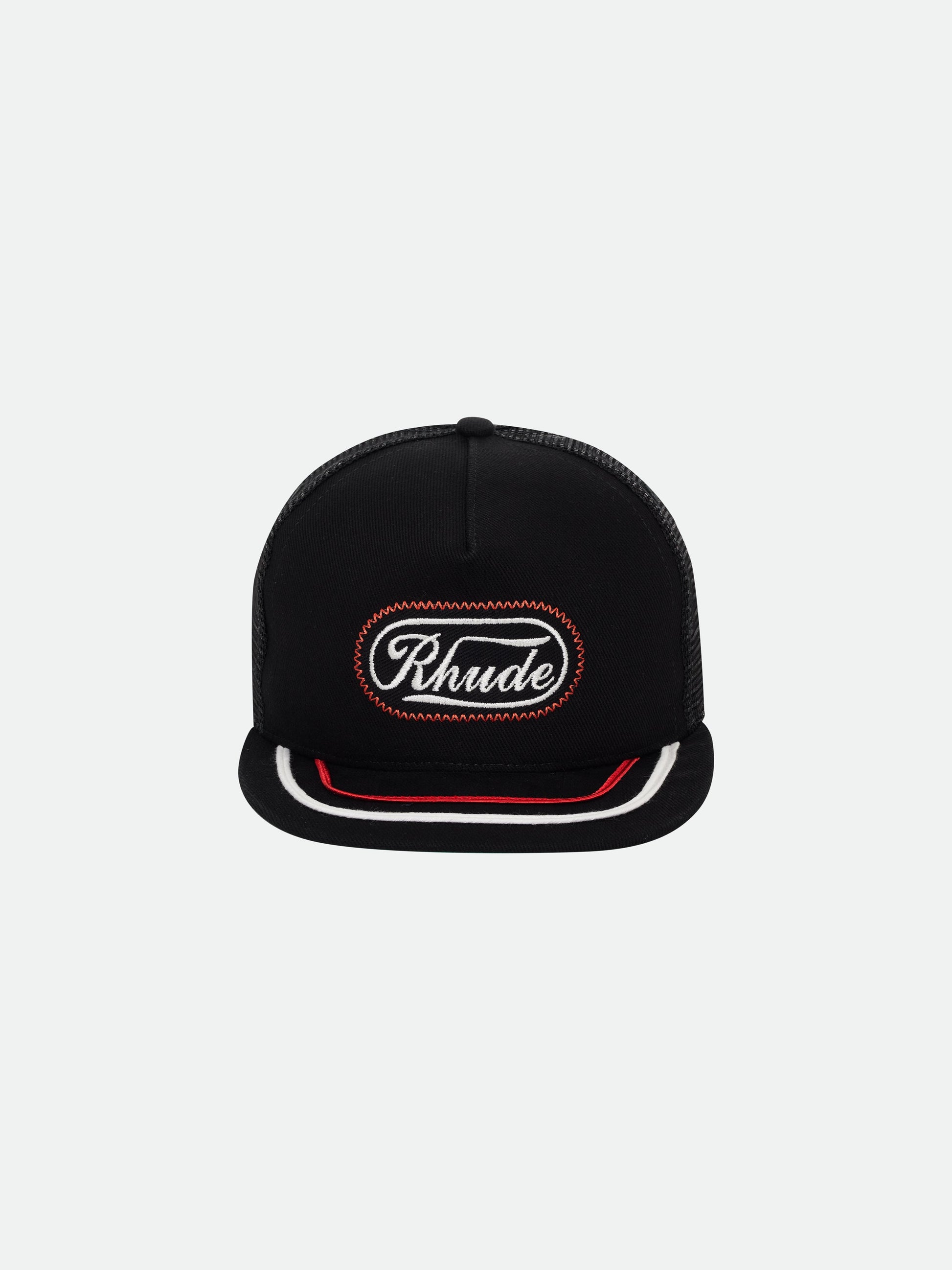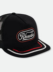 Heavyweight vintage trucker cap with Rhude script logo embroidered patch on the front. Back panel is constructed with a breathable mesh material. Features an adjustable snap strap at the back, so you can adjust the fit to your preference, and green under brim.