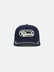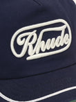 Heavyweight vintage trucker cap with Rhude script logo embroidered patch on the front. Back panel is constructed with a breathable mesh material. Features an adjustable snap strap at the back, so you can adjust the fit to your preference, and green under brim.