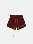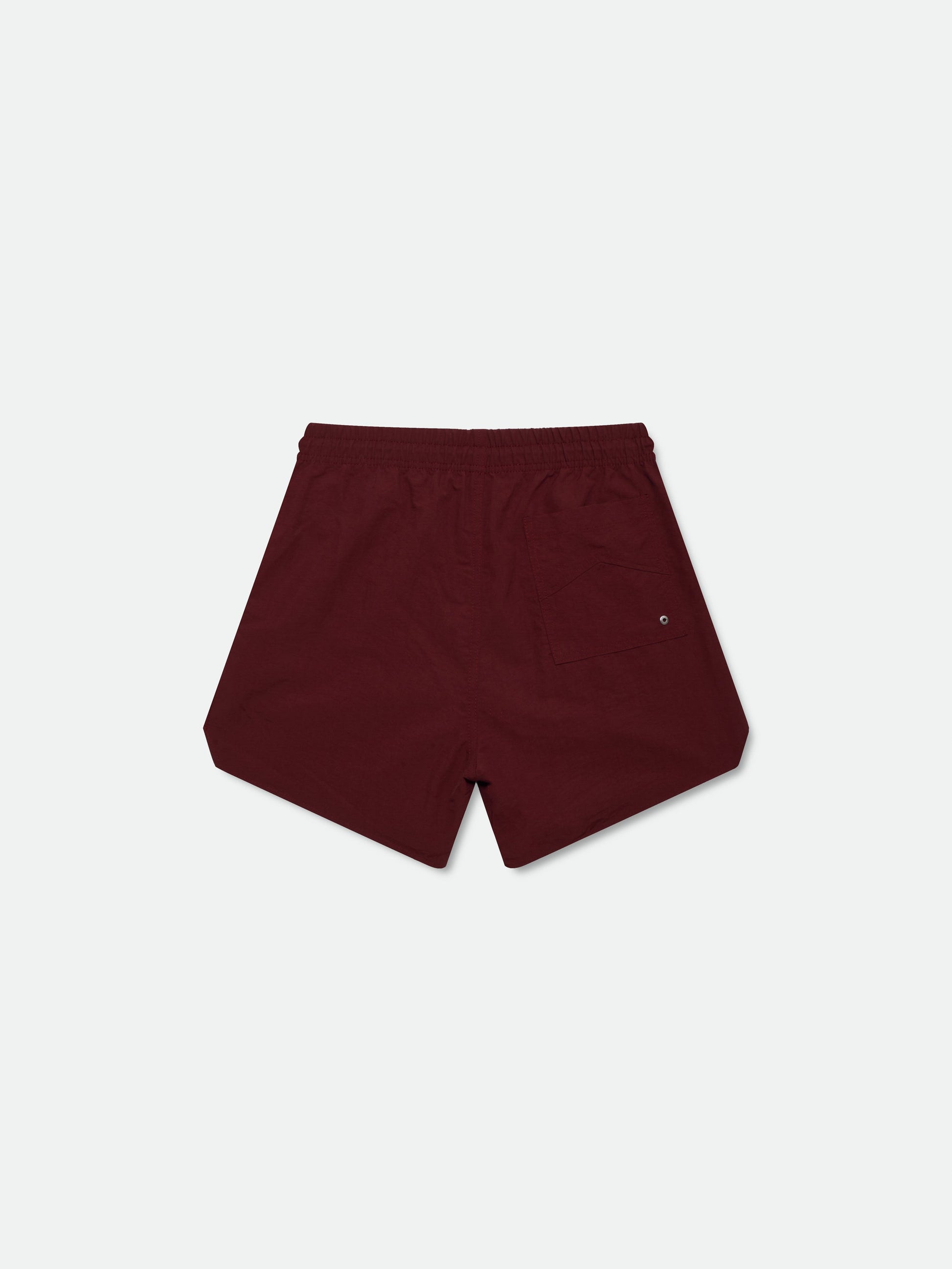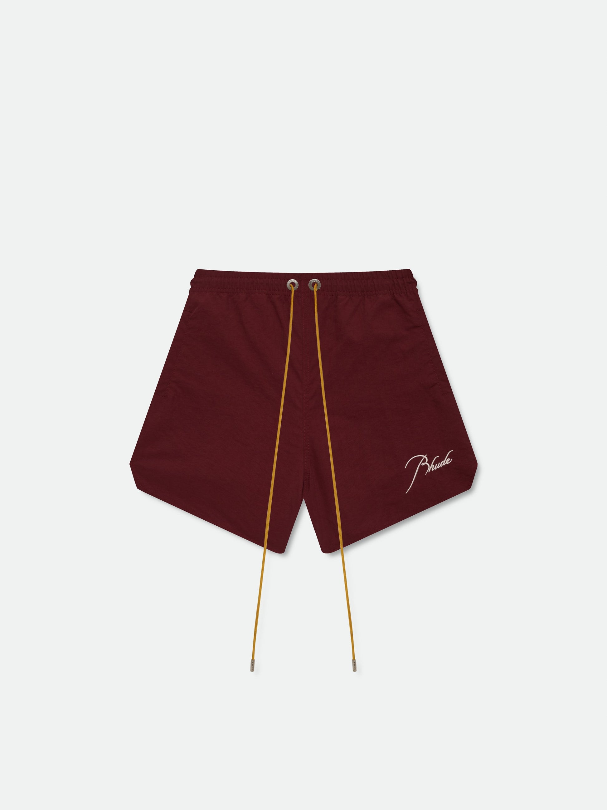 Premium swim shorts featuring Rhude script logo on front leg, an elasticated waistband, twin side pockets, and a custom Rhude chevron singular back pocket with an eyelet. Exaggerated front drawstrings in our signature mustard tone.