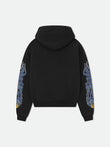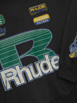 Long sleeve French Terry hoodie with Rhude Racing graphic designs printed on the front and sleeves, with a clean back. Featuring a kangaroo front pocket and dropped shoulders. Each piece is unique and print distressing my vary per style.