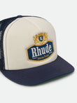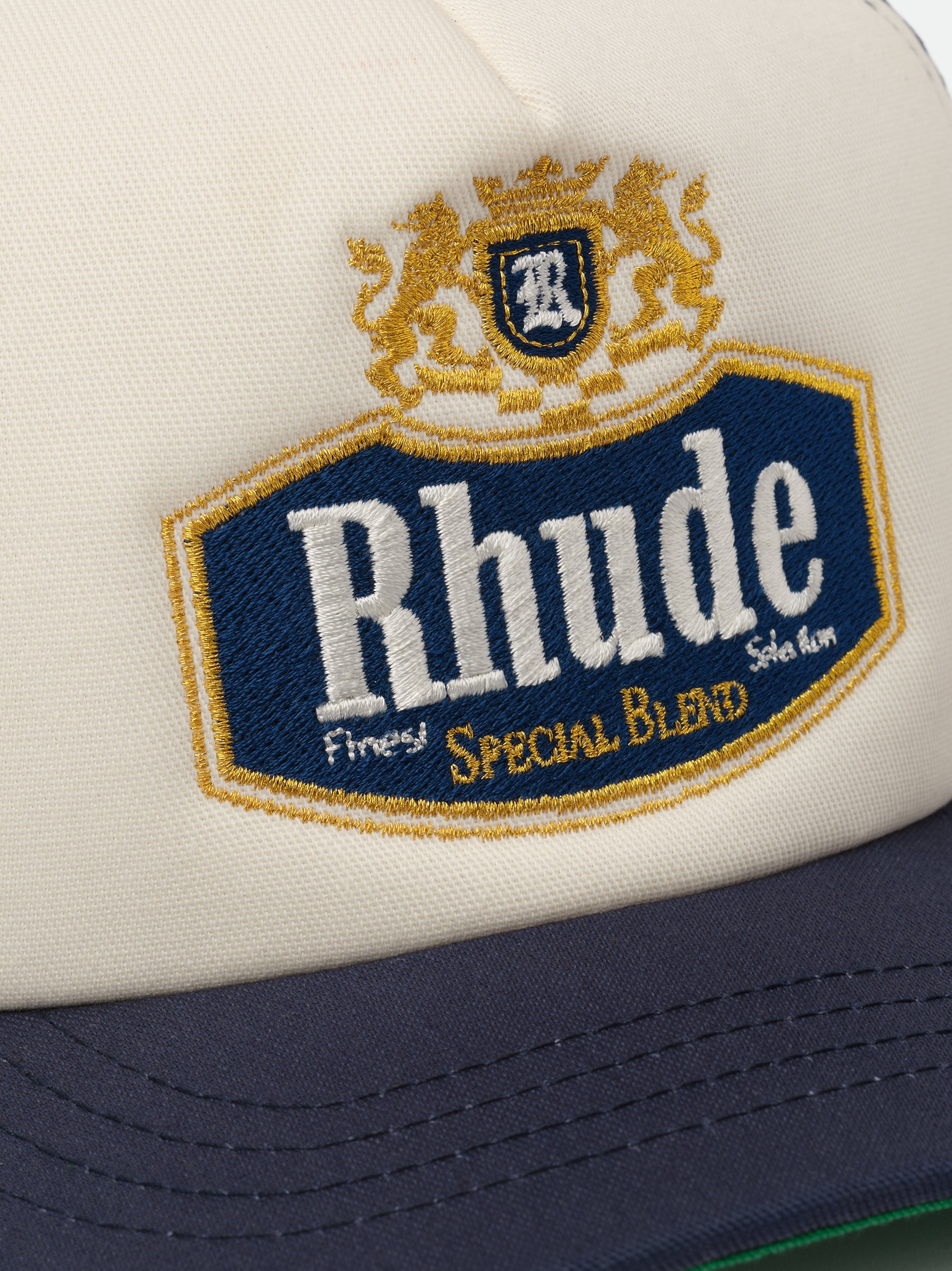 Heavyweight vintage trucker cap with Rhude Cigars "Special Blend" embroidered design on the front. Back panel is constructed with a breathable mesh material. Features an adjustable strap at the back, so you can adjust the fit to your preference, and green under brim.