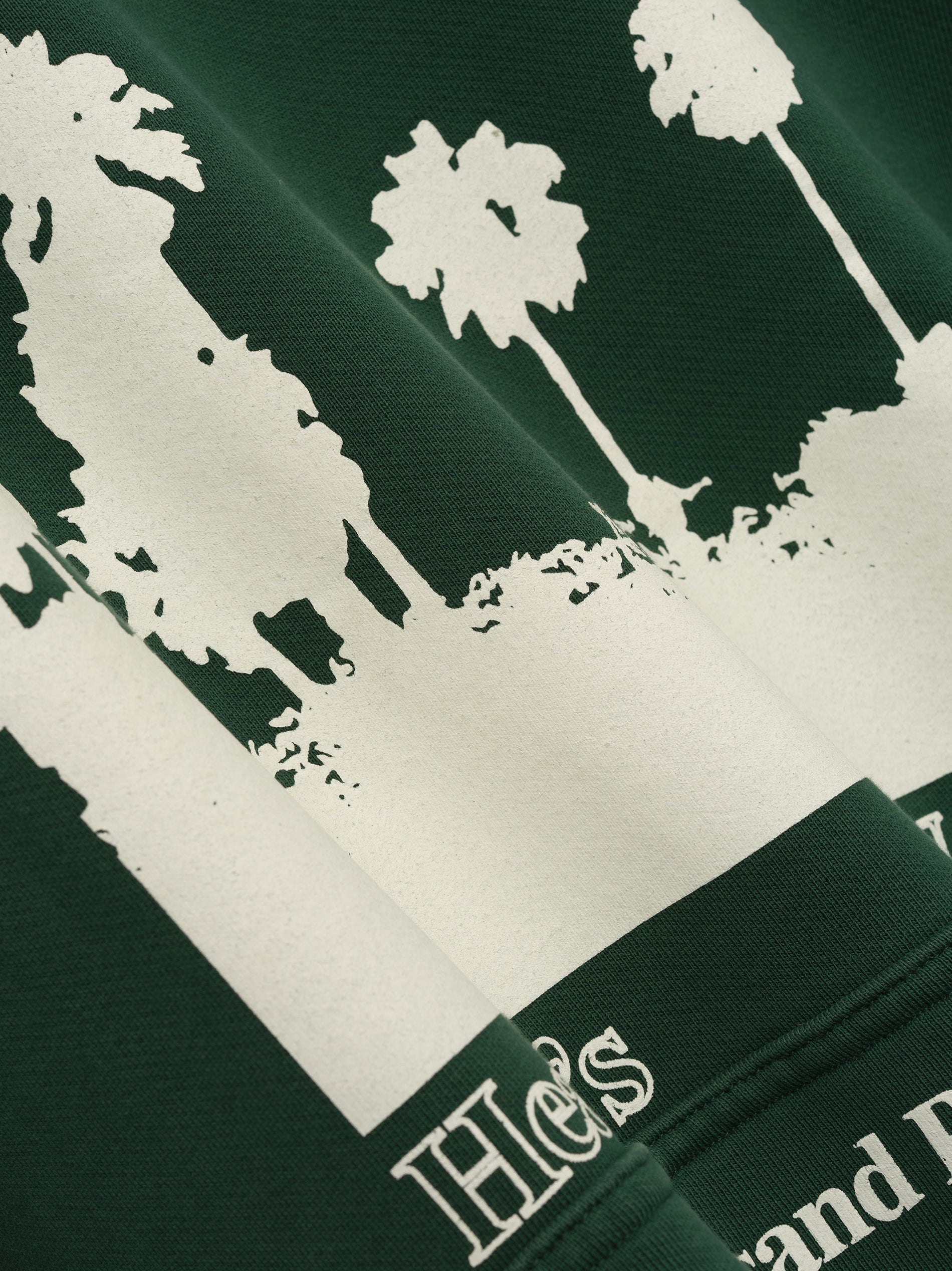 Long sleeve heavyweight hoodie with Rhude "Thousand Palms, CA, desert oasis" designs printed on the front, with a clean back. Featuring a kangaroo front pocket and dropped shoulders. Each piece is unique and print distressing my vary per style.