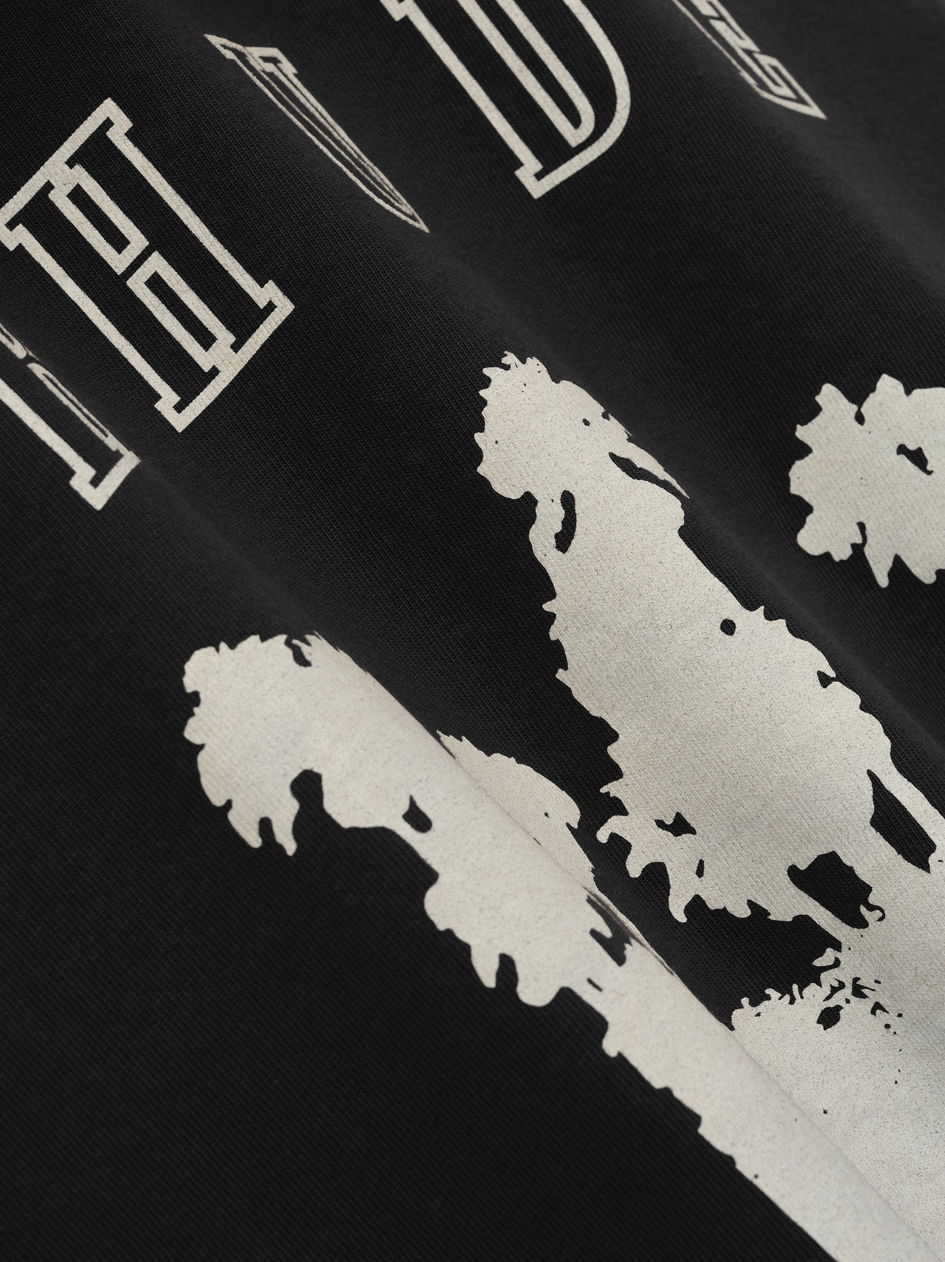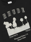 Custom-fit vintage wash cotton short sleeve tee-shirt with Rhude "Thousand Palms, CA, desert oasis" designs printed on the front, with a clean back.