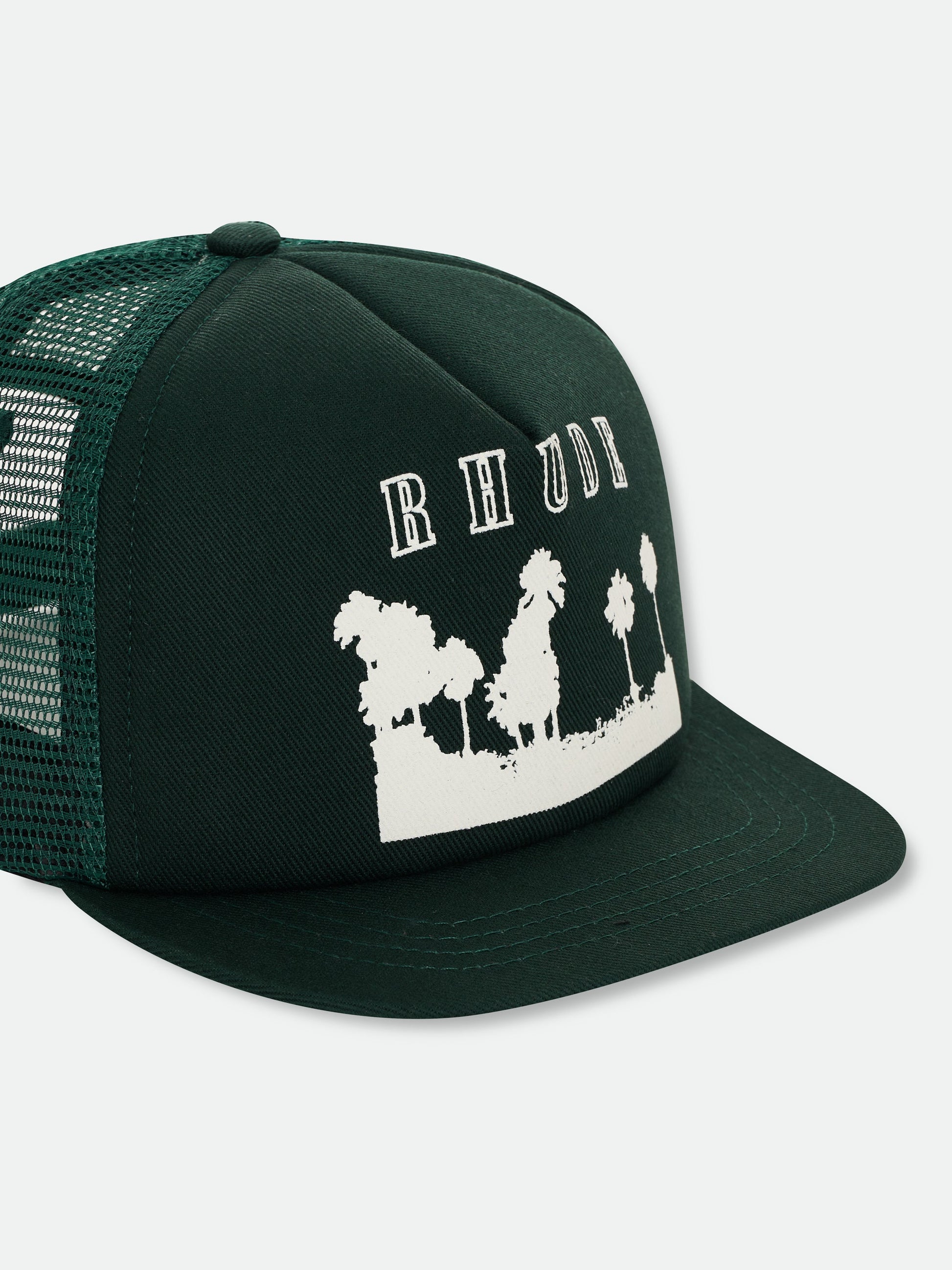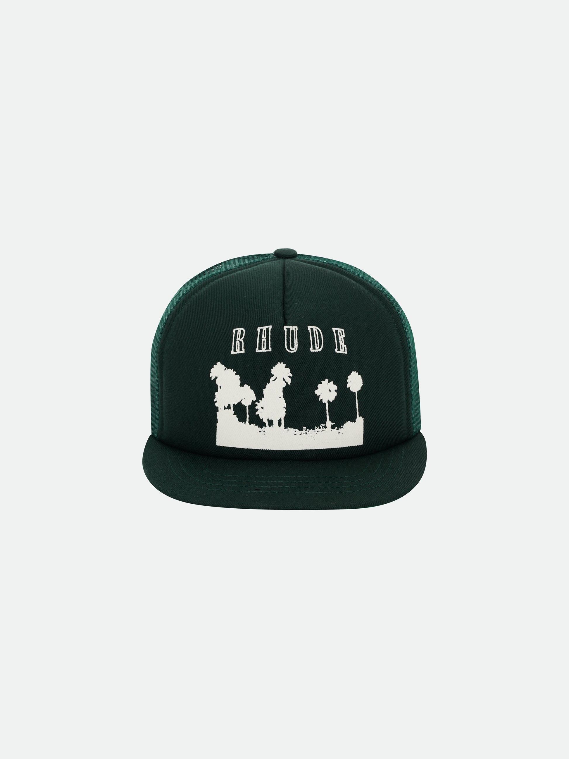 Heavyweight vintage trucker cap with Rhude "Thousand Palms" printed design on the front. Back panel is constructed with a breathable mesh material. Features an adjustable strap at the back, so you can adjust the fit to your preference, and green under brim.