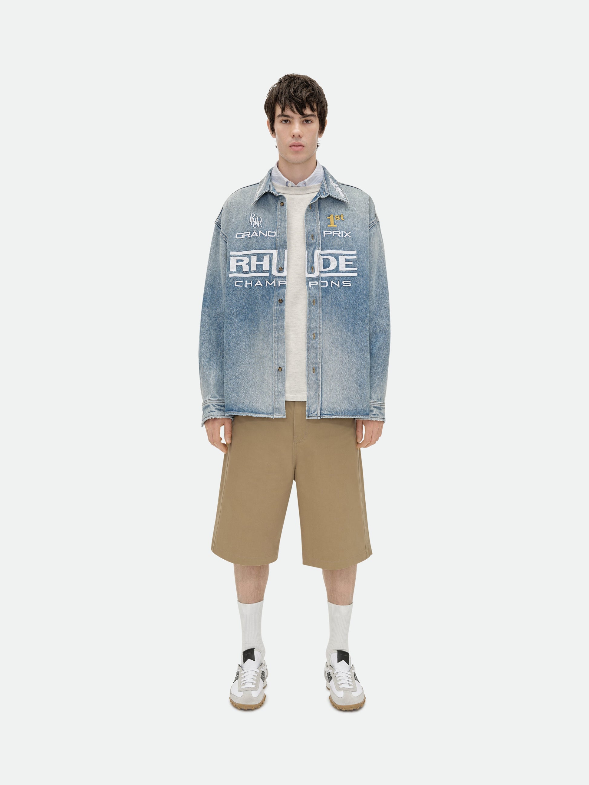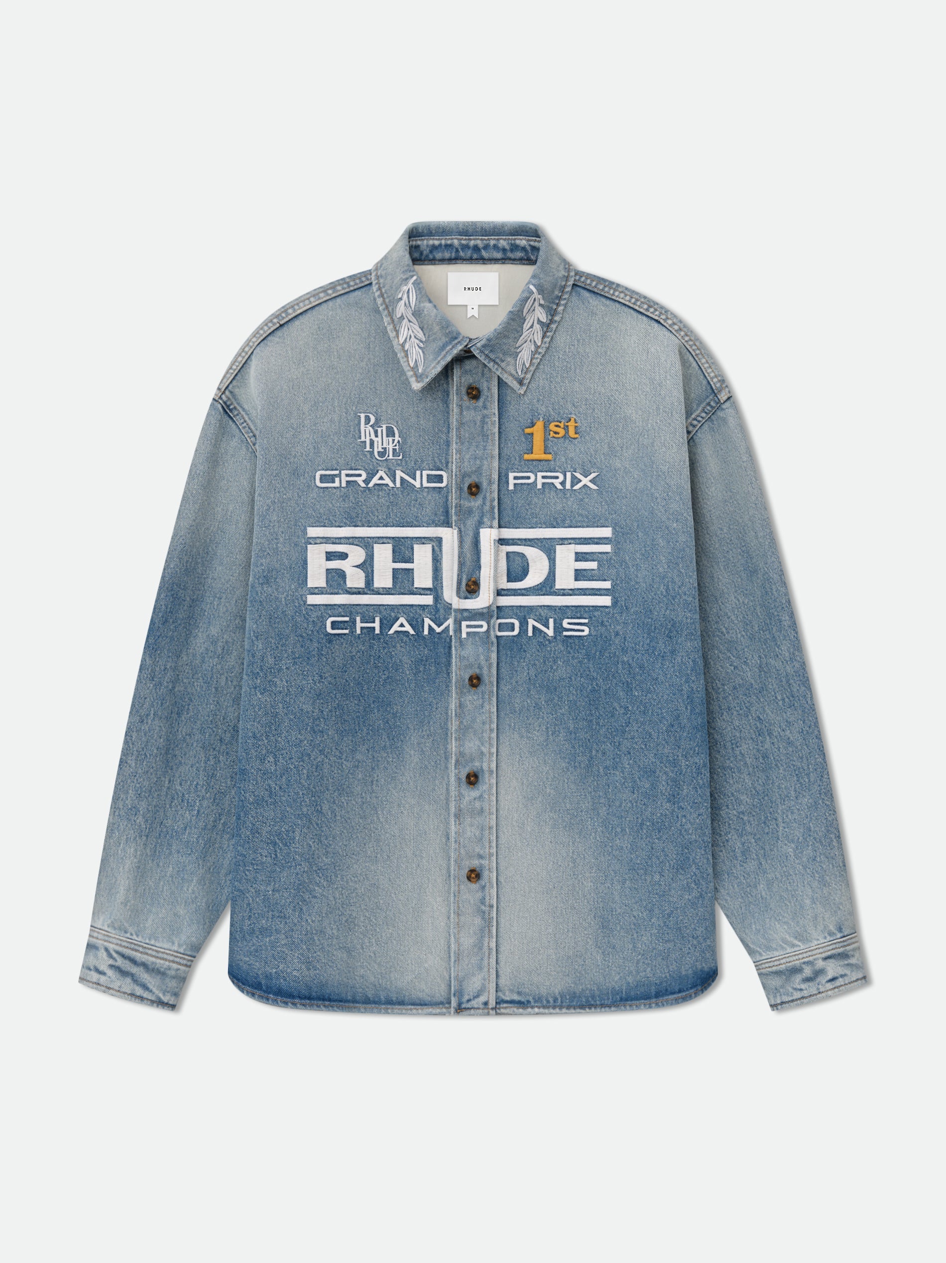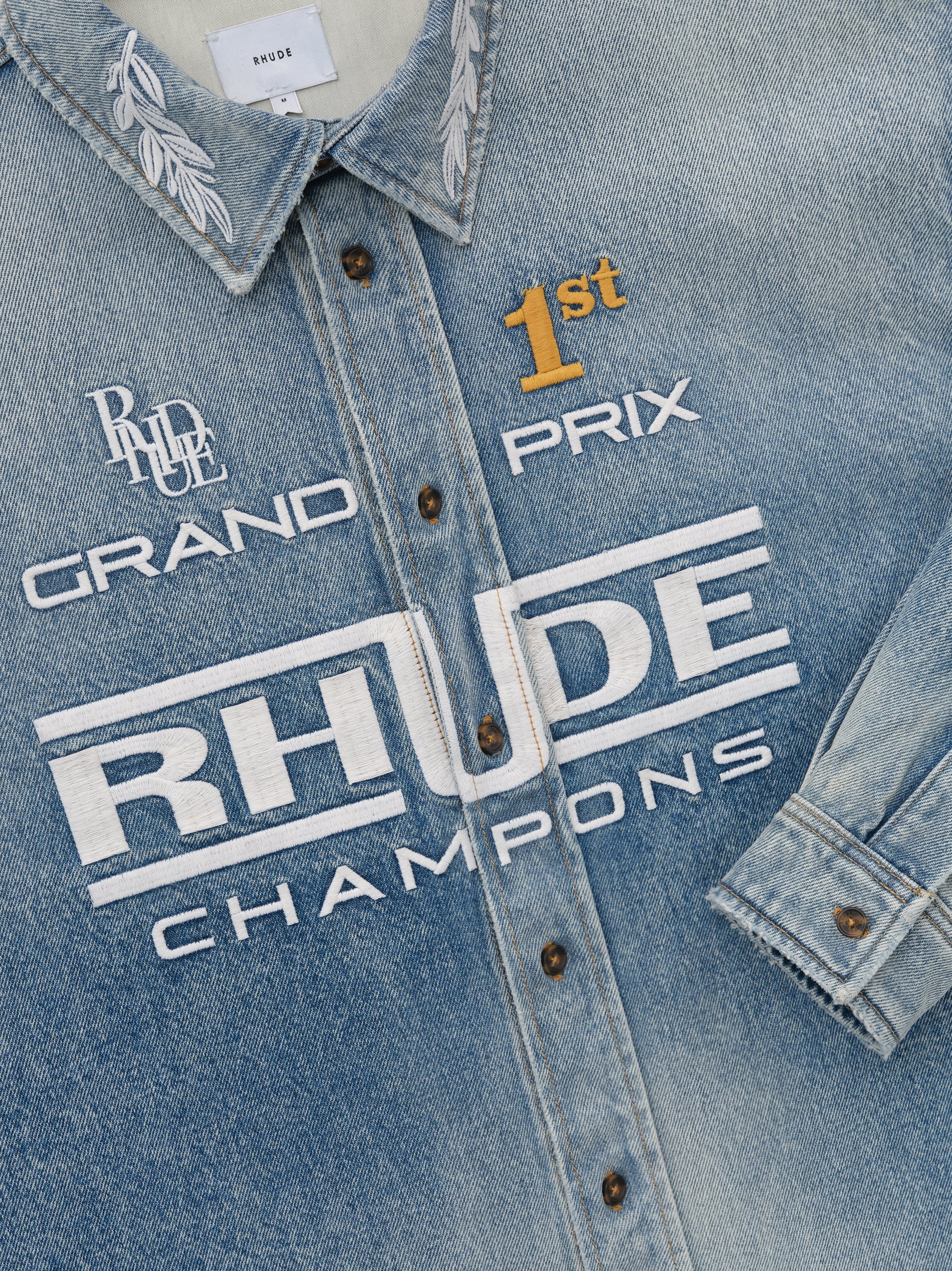 Upgrade your casual style with our Premium Long Sleeve Denim Overshirt. Featuring embroidered designs of RHUDE logos, Grand Prix Rhude Champions. Includes full front button opening with custom Rhude closures.